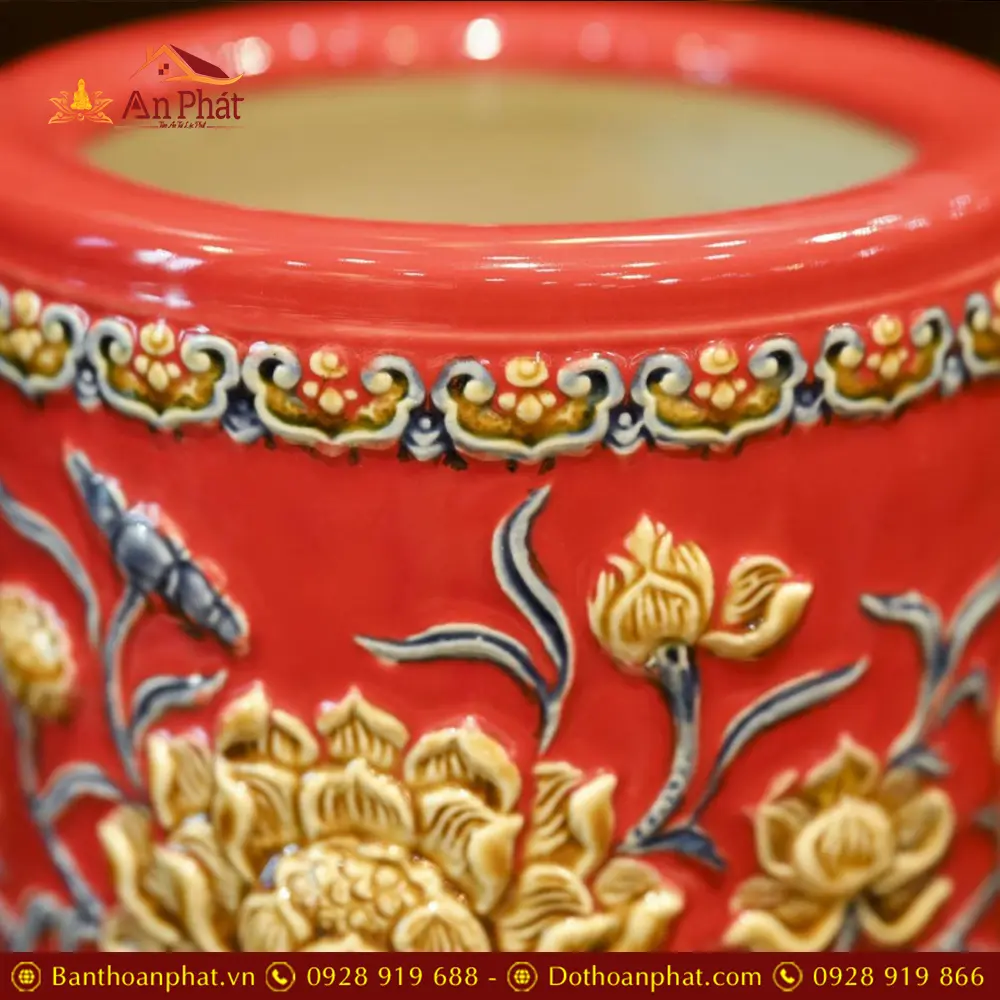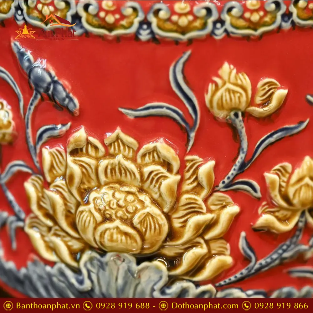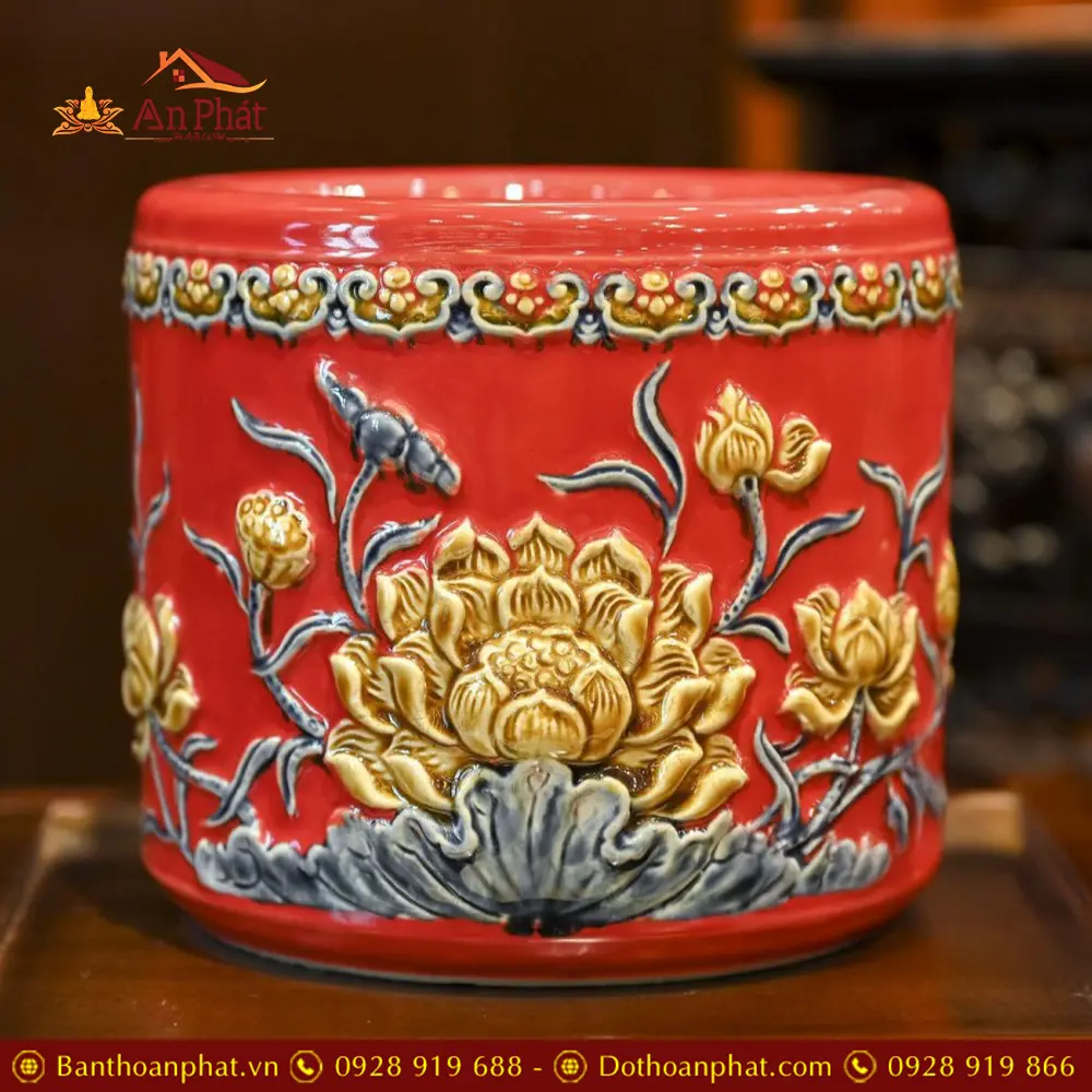 Bát Hương Men Đỏ Đắp Nổi Hoa Sen Gốm Bát Tràng DT685
