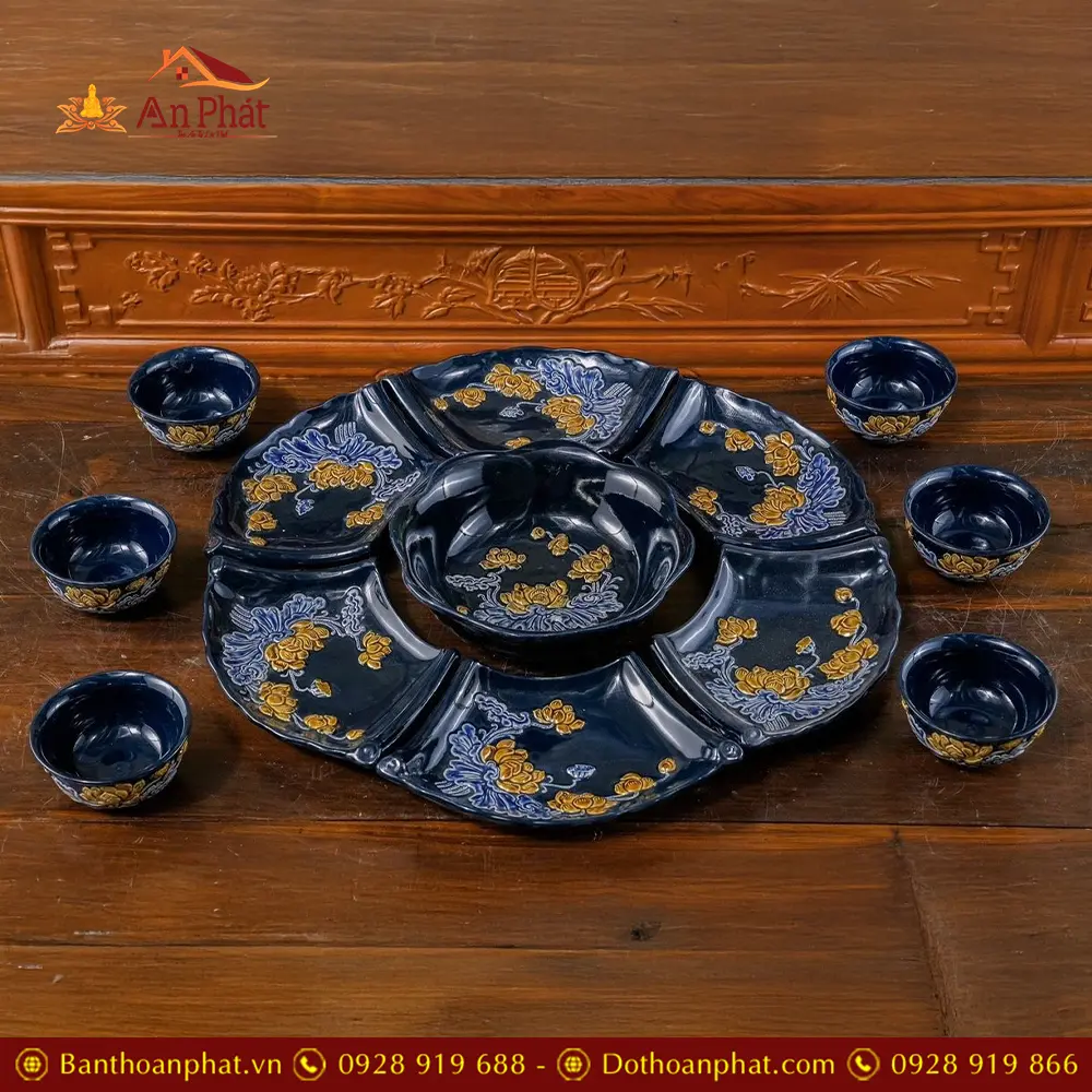 Bộ Bát Đĩa Thờ Cúng Bát Tràng Men Màu Xanh Coban Đắp Nổi DT916
