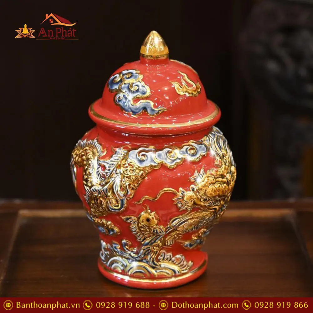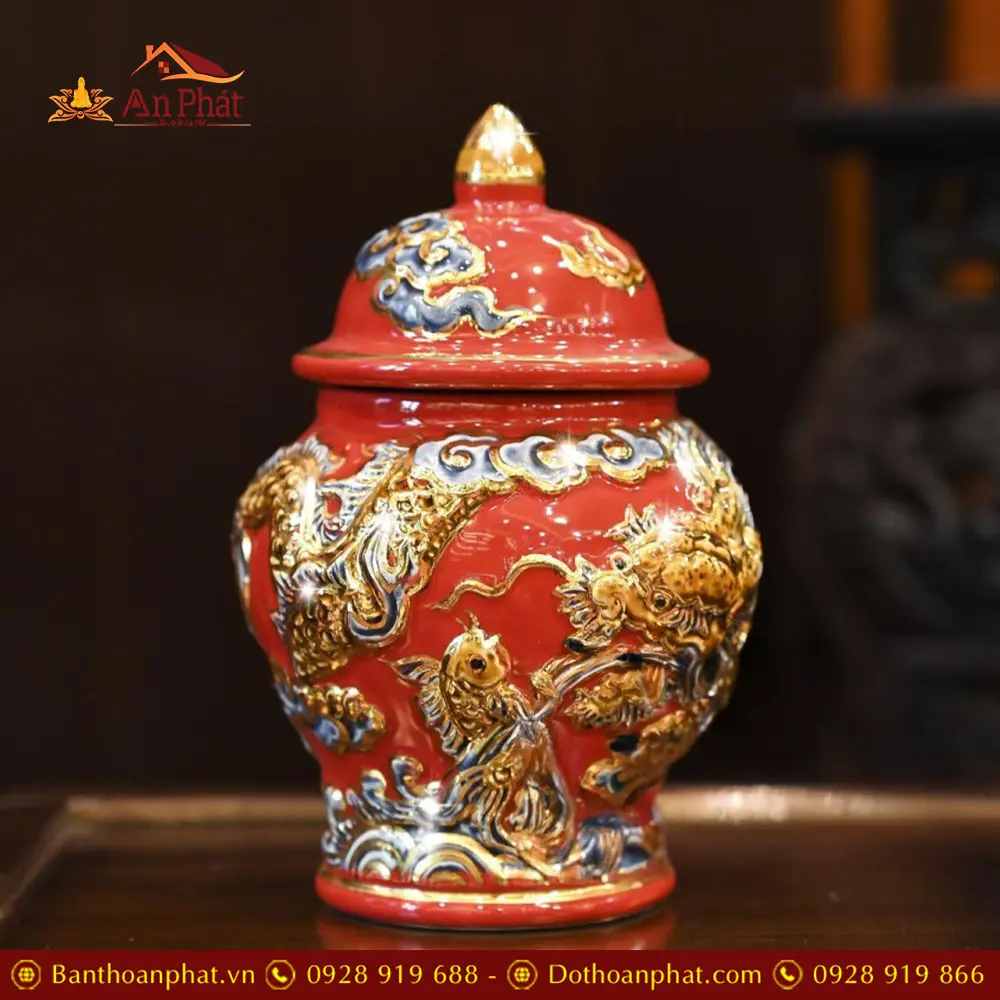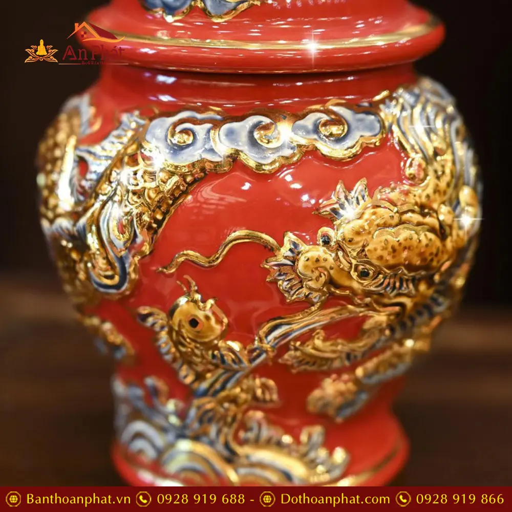 • Chất liệu: Men Đỏ Đắp Nổi Vẽ Vàng 24K