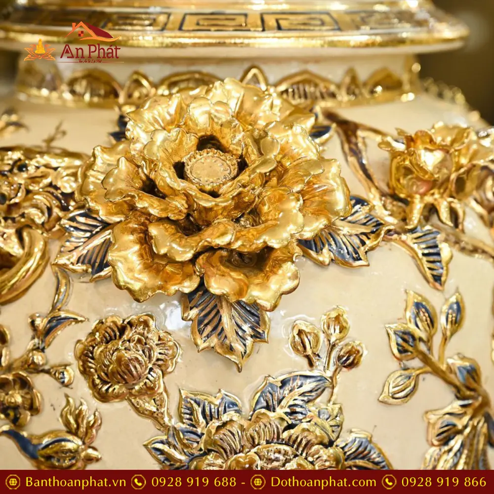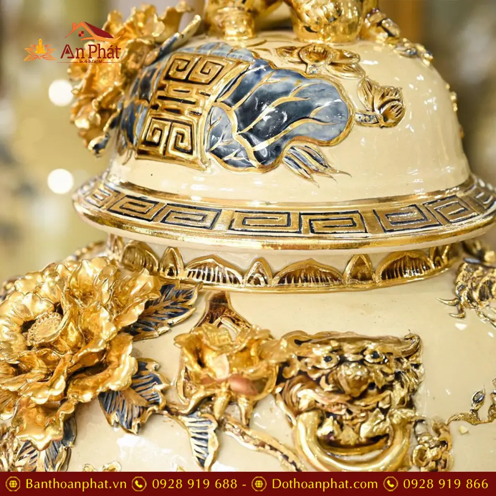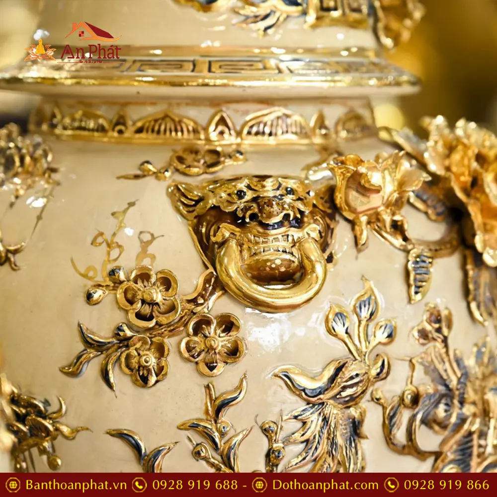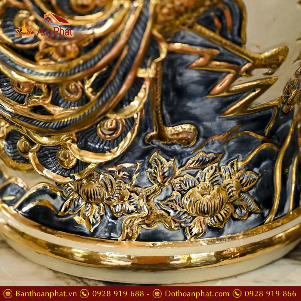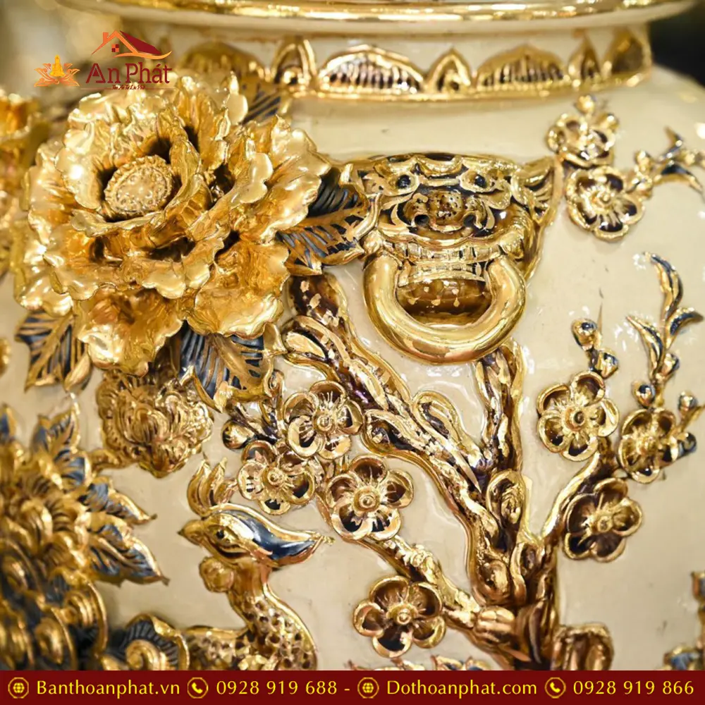 • Chất liệu: Men Hoàng Thổ Đắp Nổi Vẽ Vàng