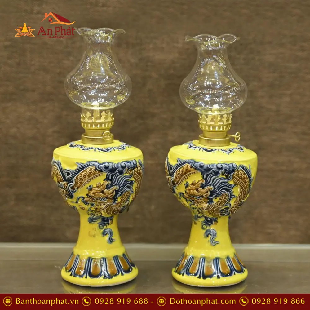 Đèn Dầu Bát Tràng Men Màu Vàng Thường Đắp Nổi Rồng DT770