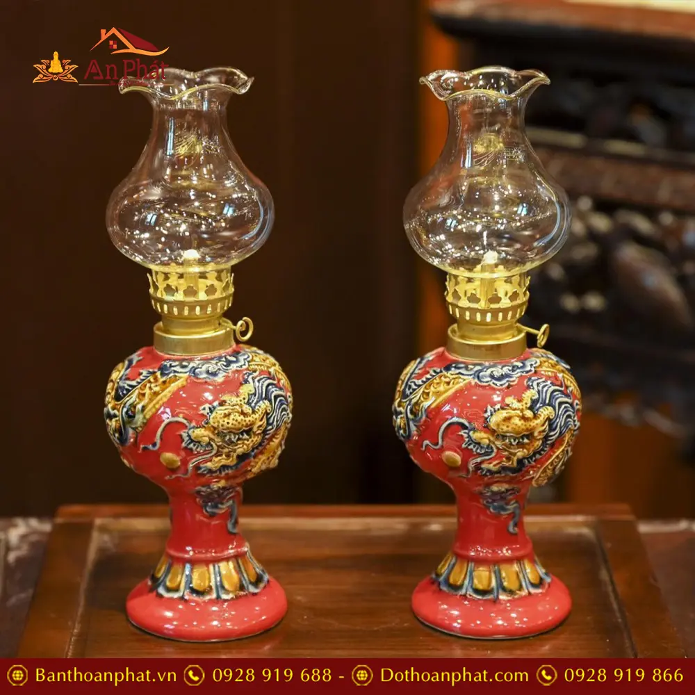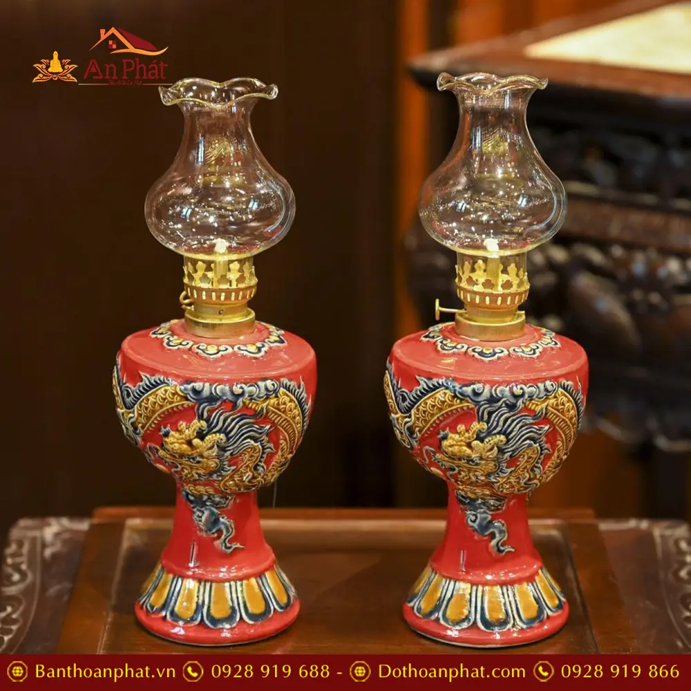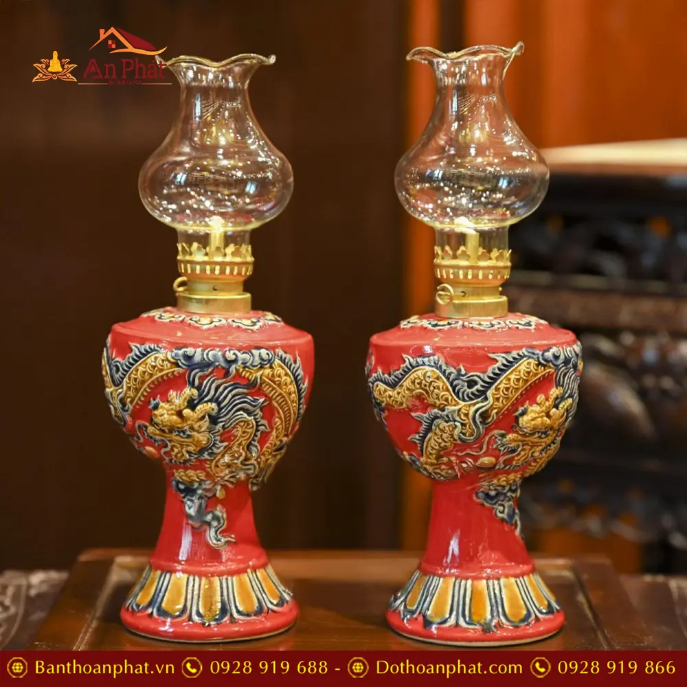 Đèn Dầu Thờ Men Màu Đỏ Đắp Nổi Rồng Gốm Bát Tràng DT766