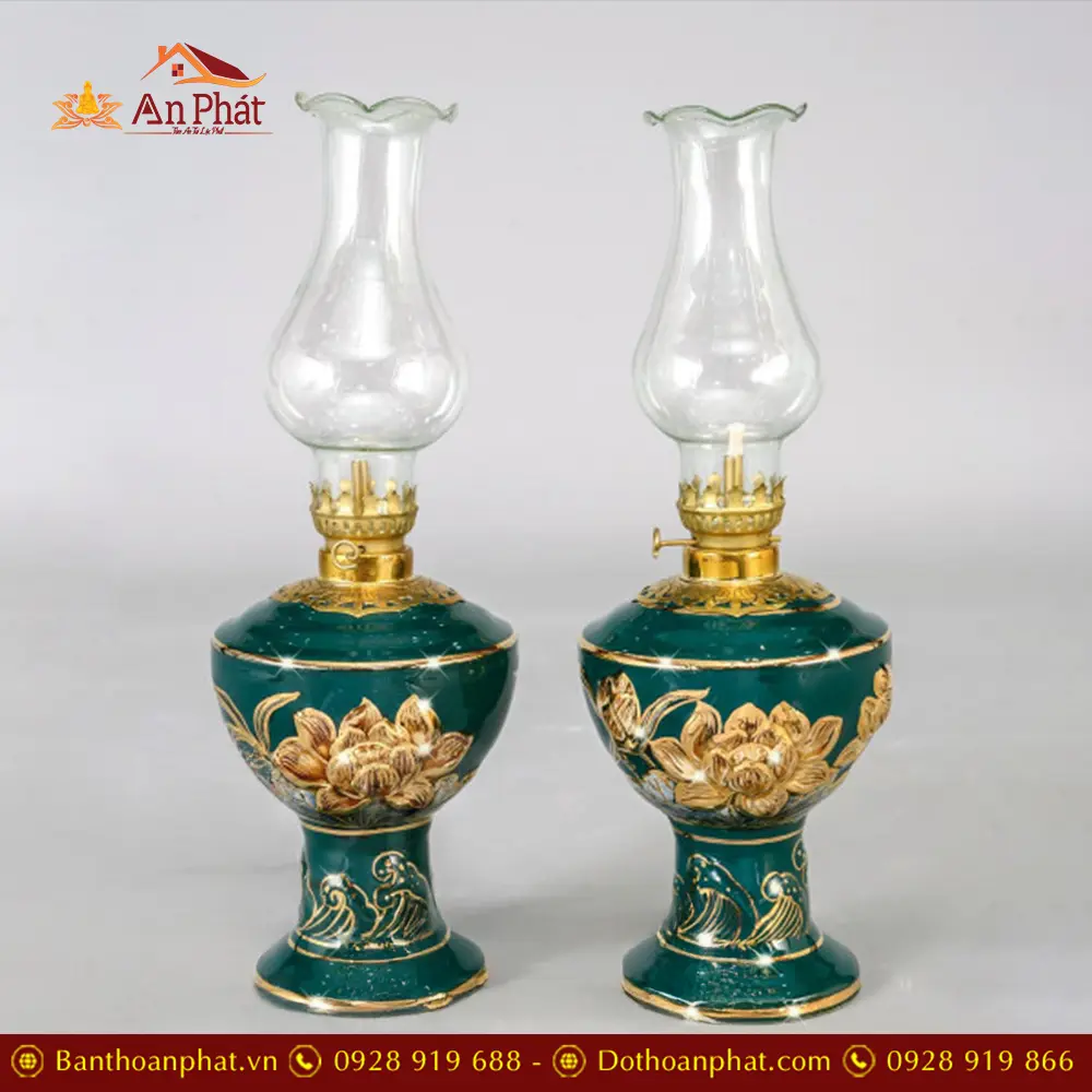 Đèn Dầu Thờ Men Màu Xanh Đắp Nổi Vẽ Vàng DT779