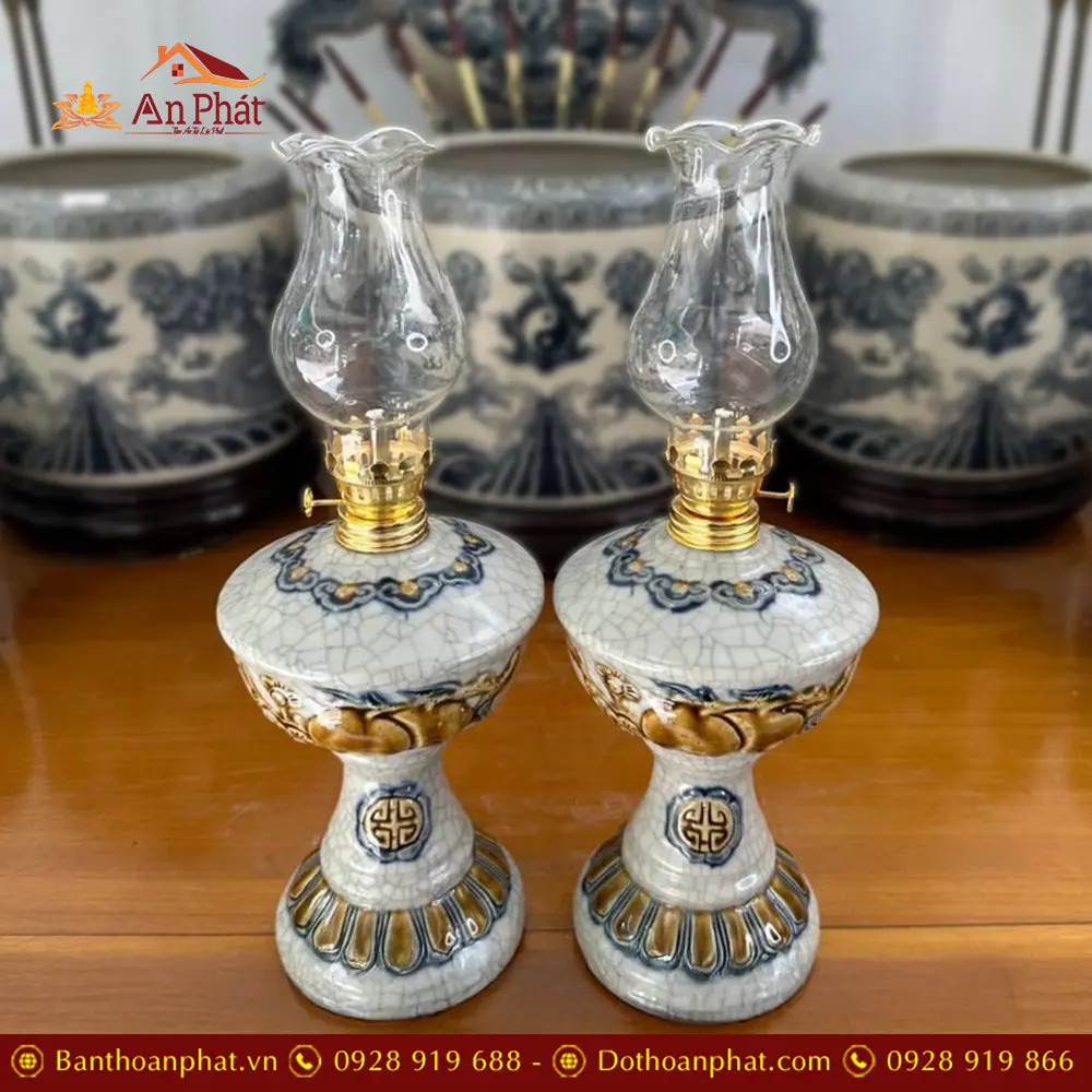 Đèn Thờ Dầu Bát Tràng Men Rạn Đắp Nổi Mẫu Đào DT763