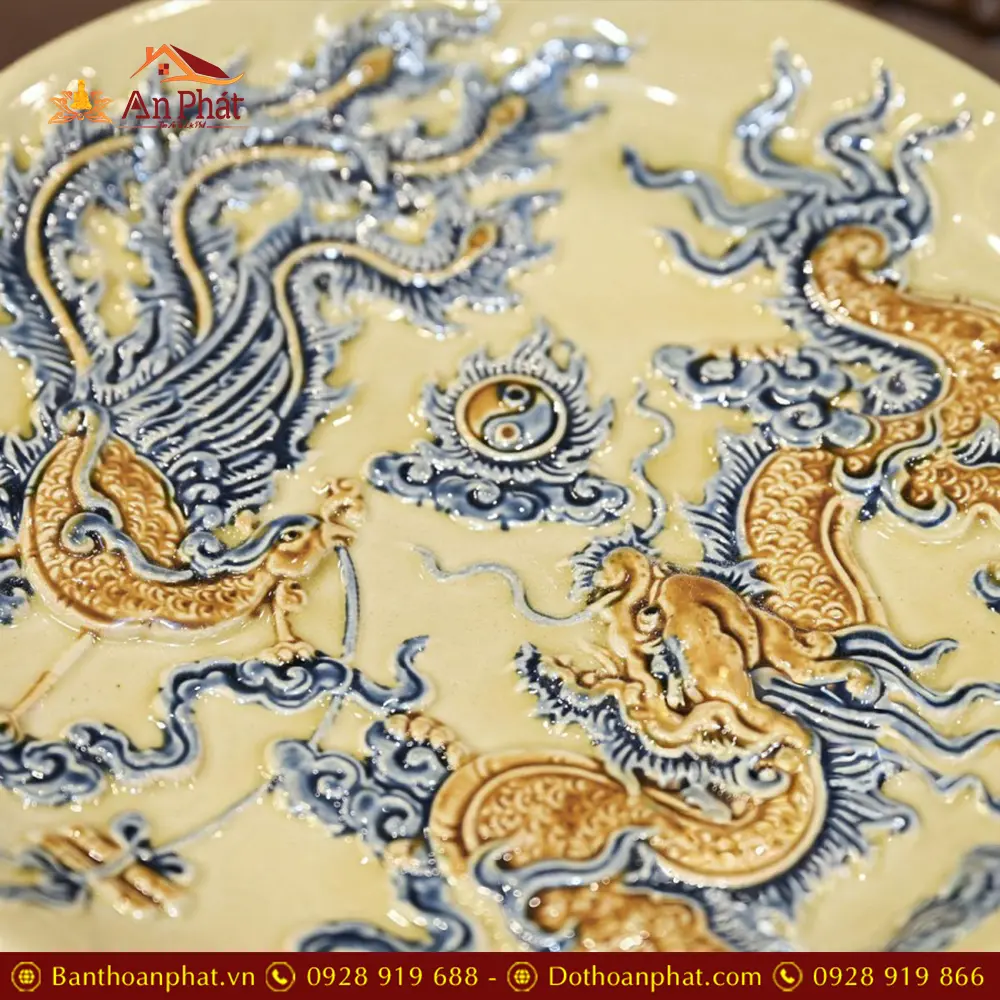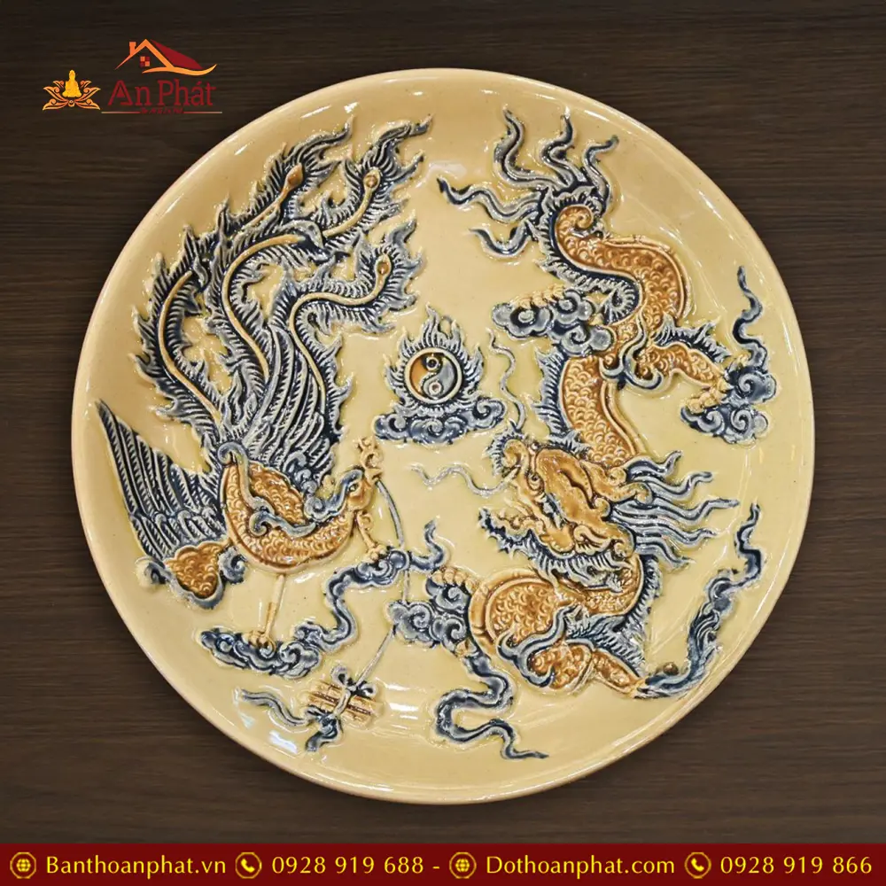 Đĩa Thờ Long Phụng Chầu Nguyệt Men Hoàng Thổ Đắp Nổi DT704