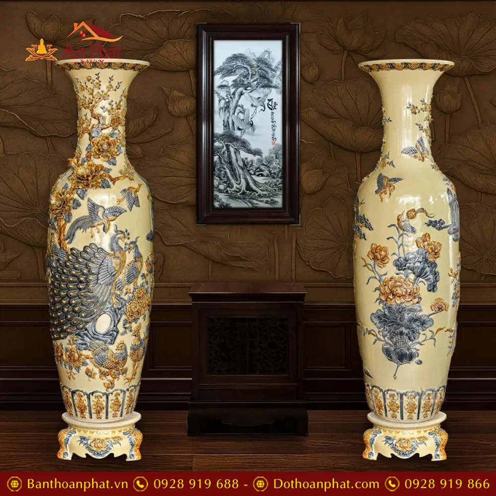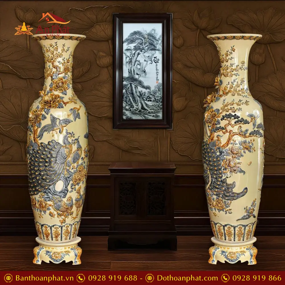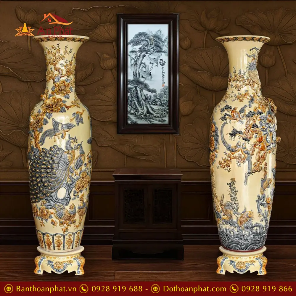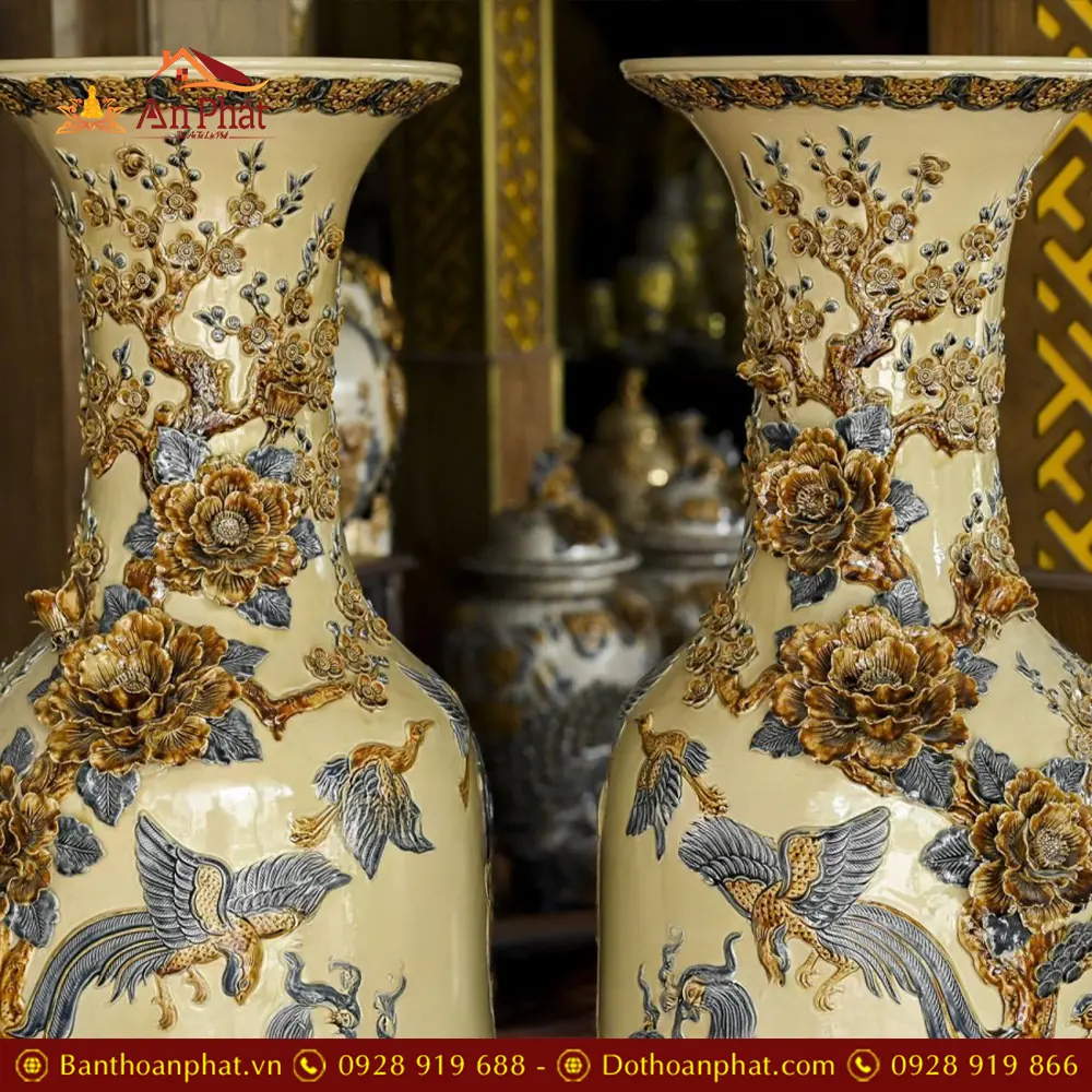 Đôi Lộc Bình Hoàng Thổ Đắp Nổi Công Đào Kênh Bát Tràng DT924
