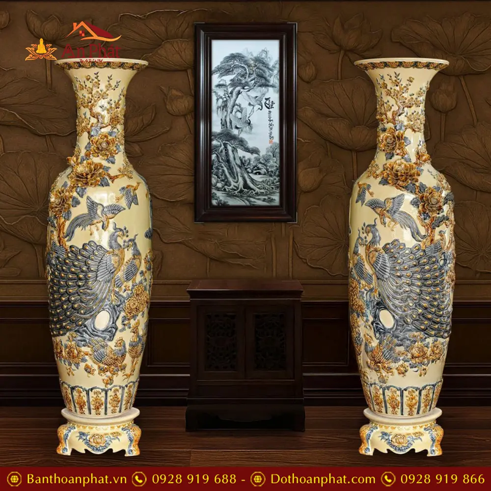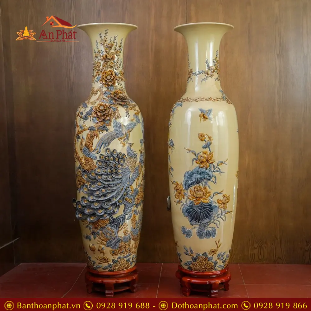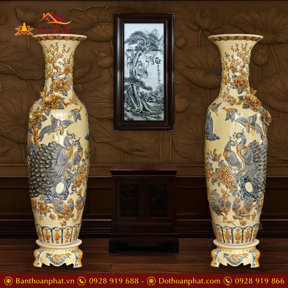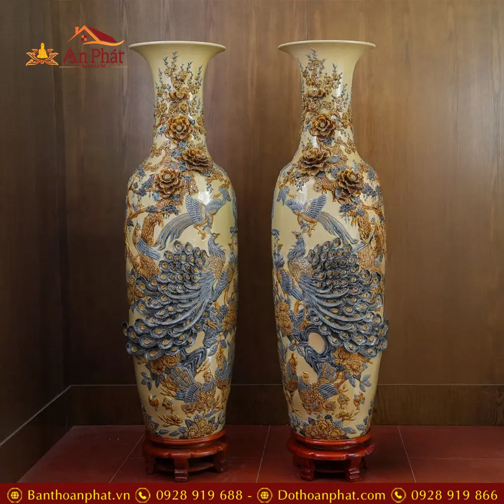 Đôi Lộc Bình Hoàng Thổ Đắp Nổi Công Đào Kênh Bát Tràng DT924