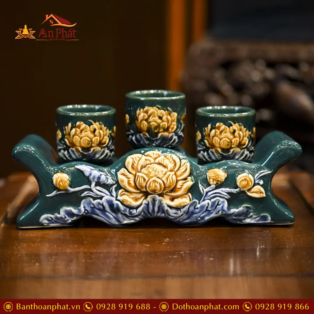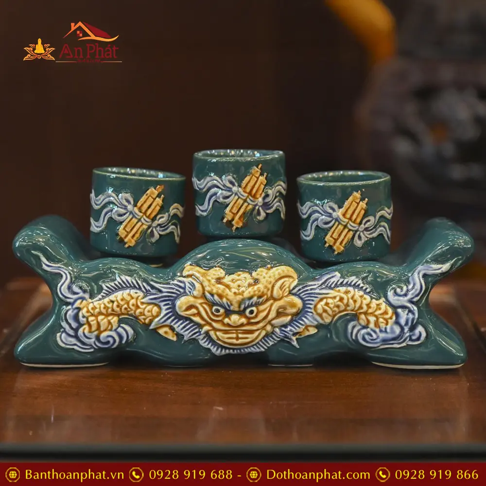 Kỷ Chén Ngai Xanh Đắp Nổi Gốm Sứ Bát Tràng DT790