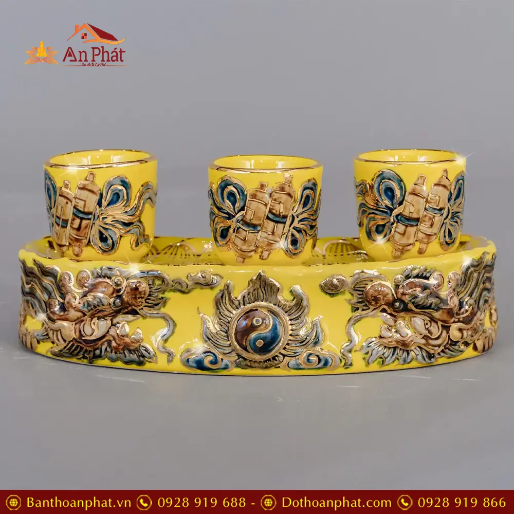 Kỷ Chén Tròn Bát Tràng Men Vàng Đắp Nổi Vẽ Vàng DT798