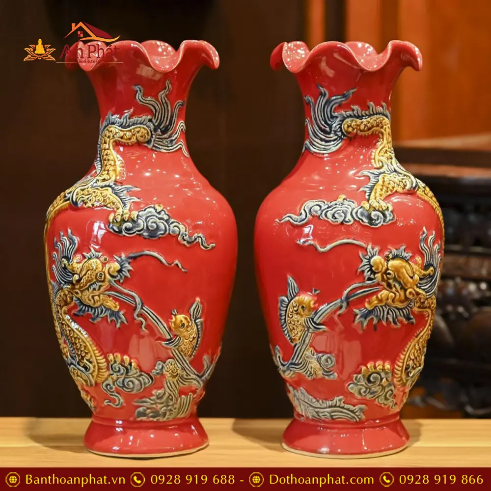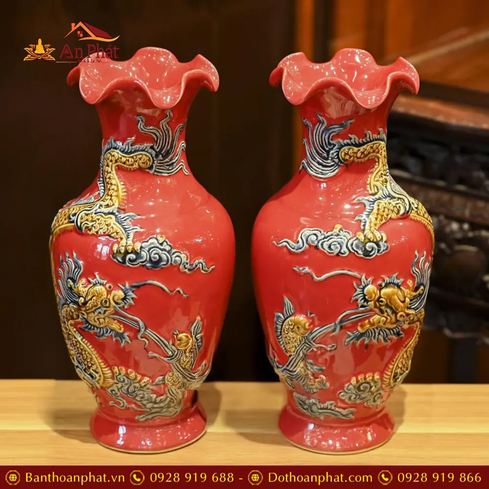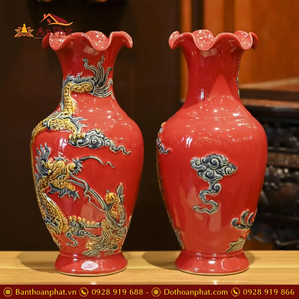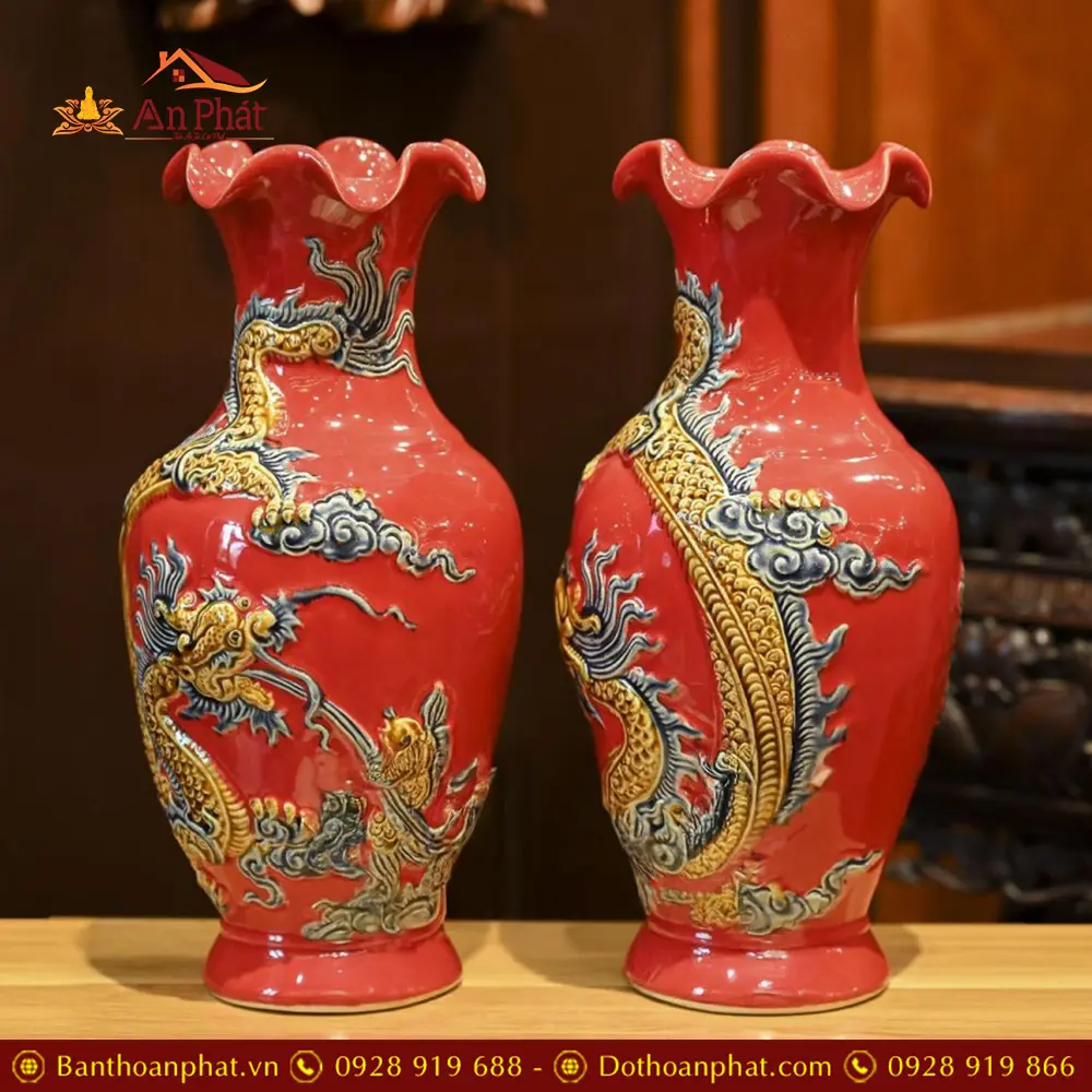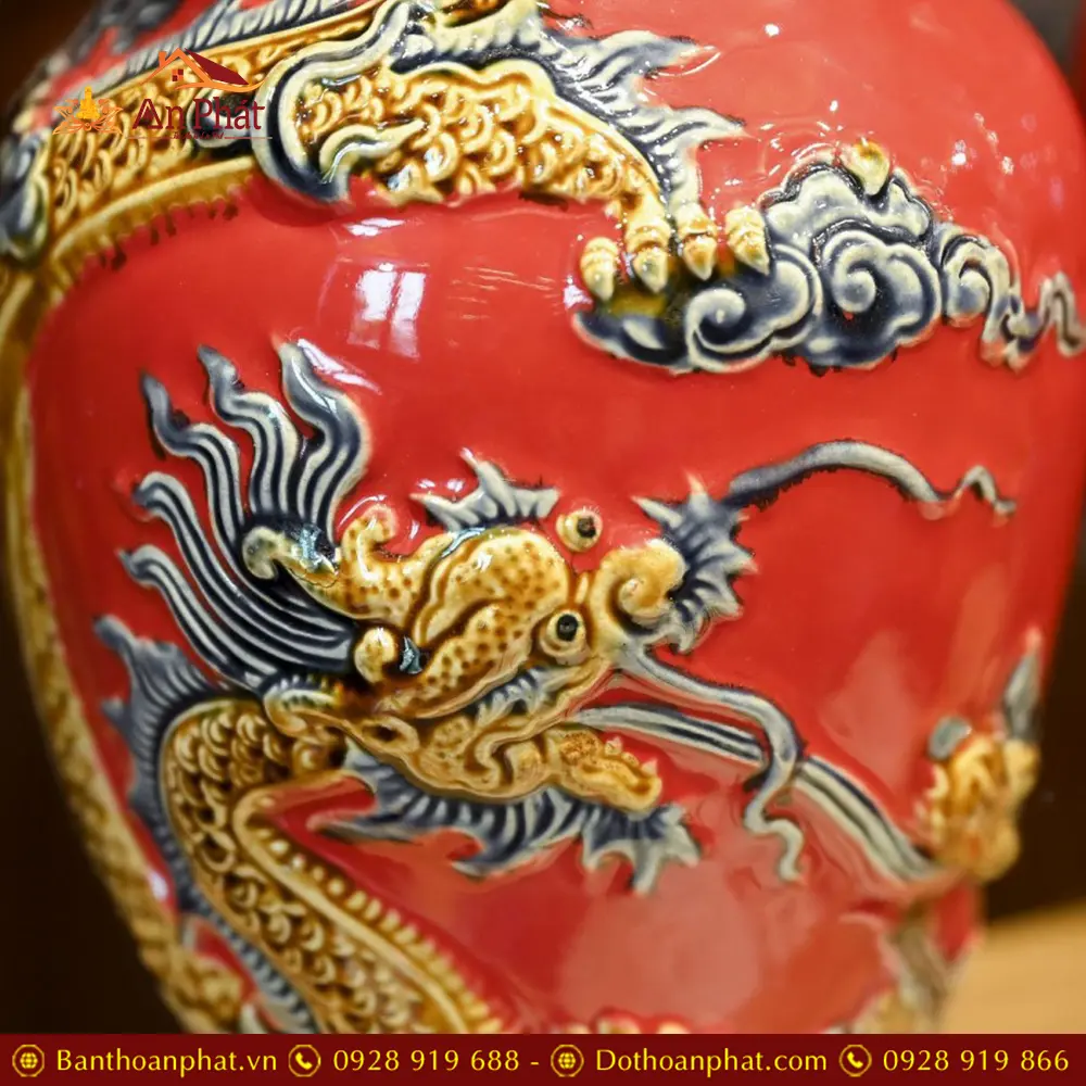 Lọ Hoa Miệng Lượn Đỏ Đắp Nổi Rồng Bát Tràng DT714