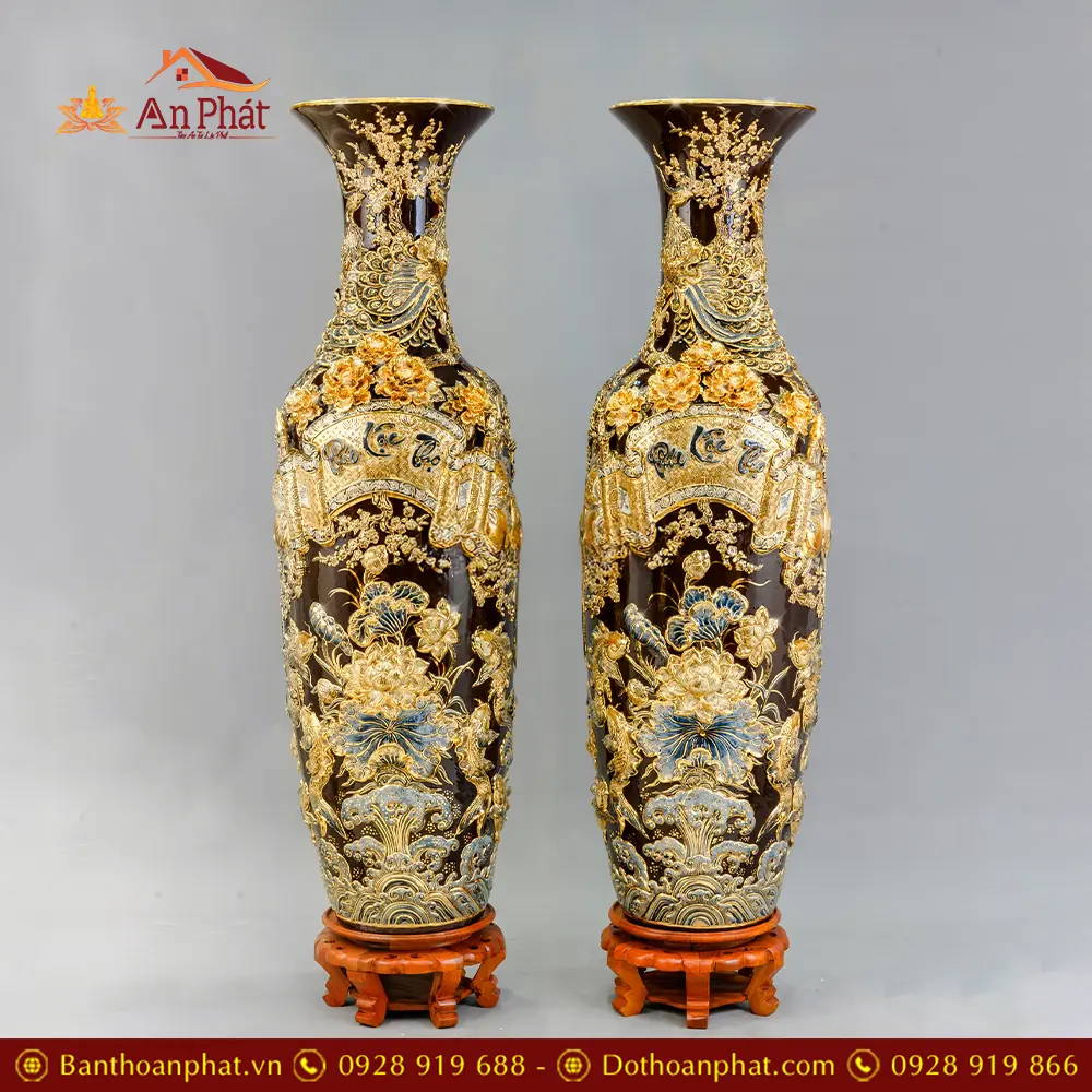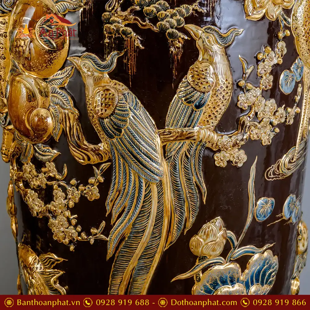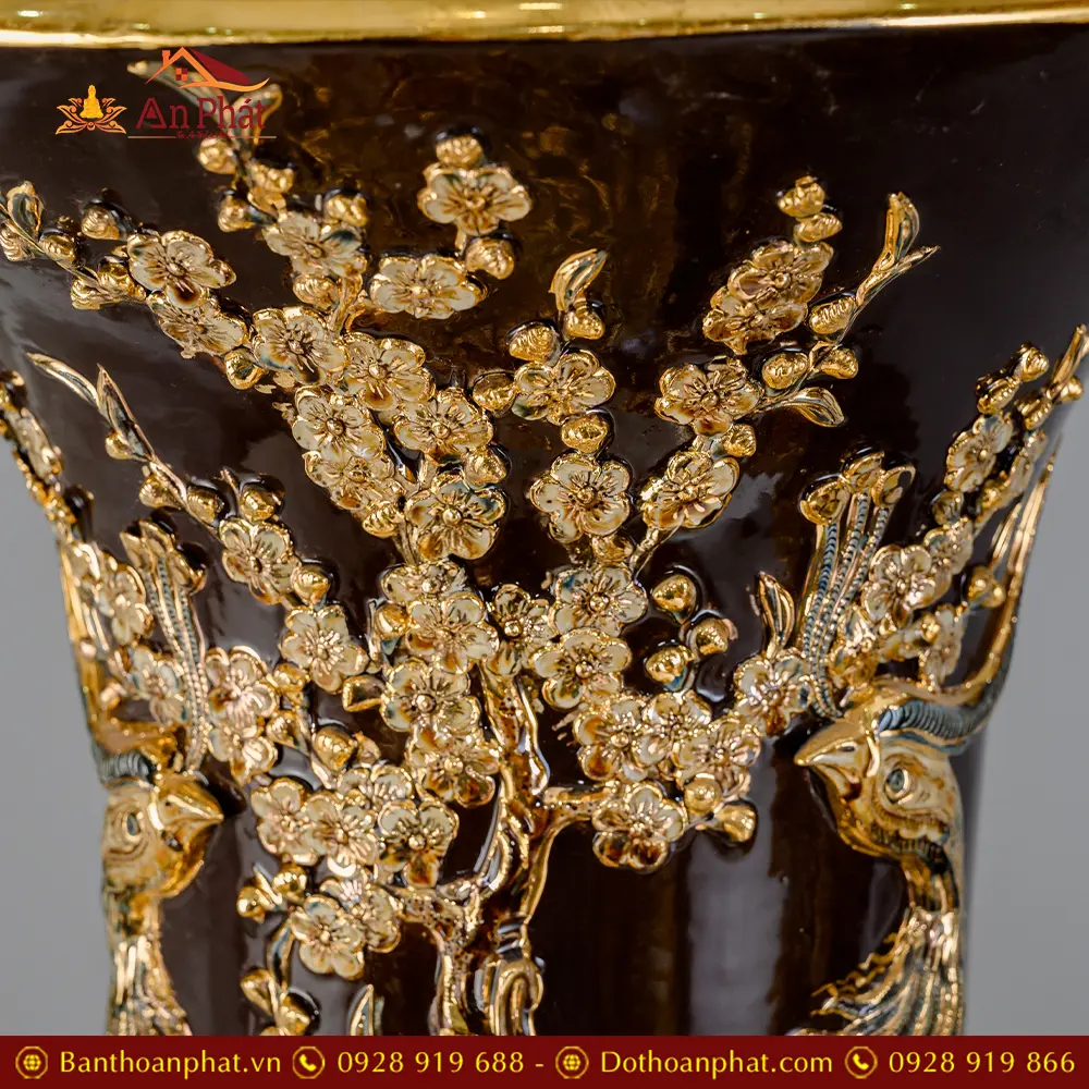 Lọ Lộc Bình Cao Cấp Vẽ Vàng Phúc Lộc Thọ Đắp Nổi Men Nâu Bát Tràng DT963