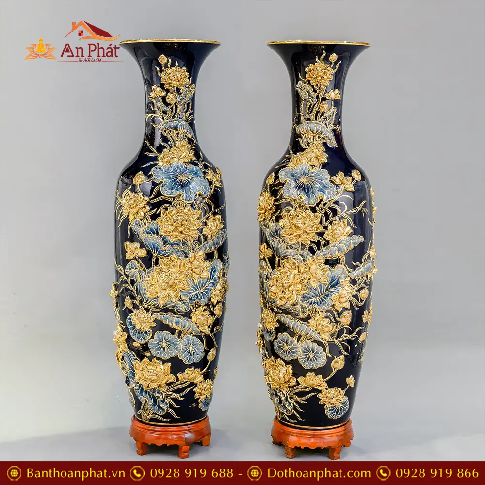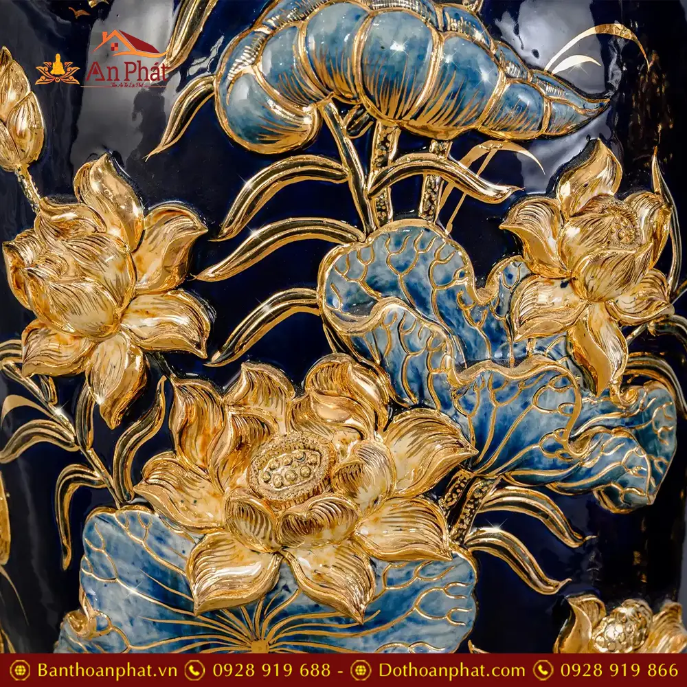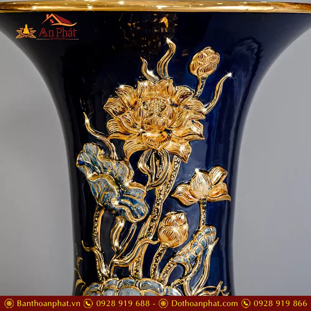 Lọ Lộc Bình Hoa Sen Vẽ Vàng Cao Cấp Xanh Coban Đắp Nổi DT960