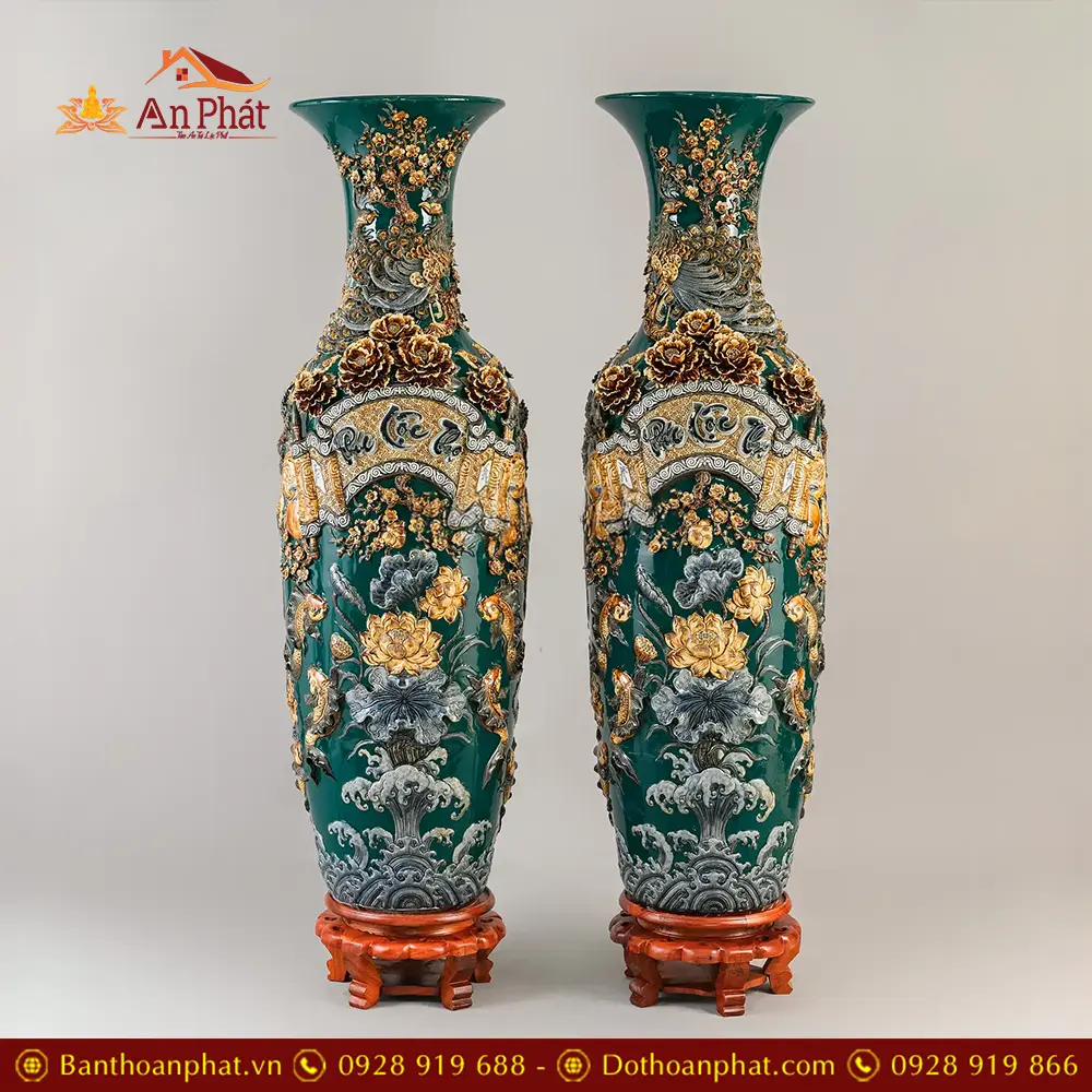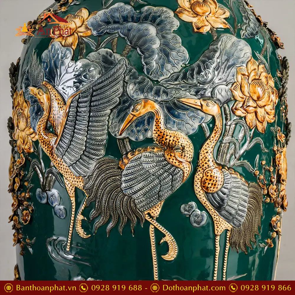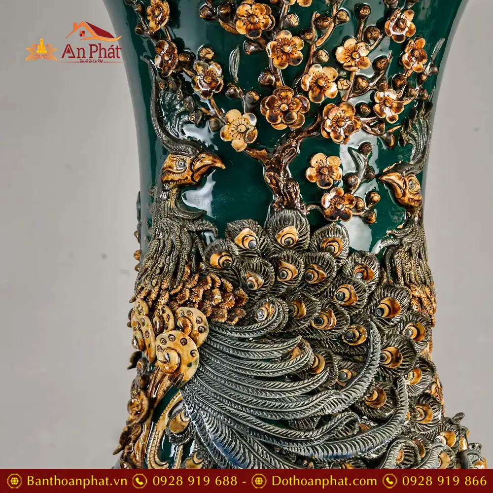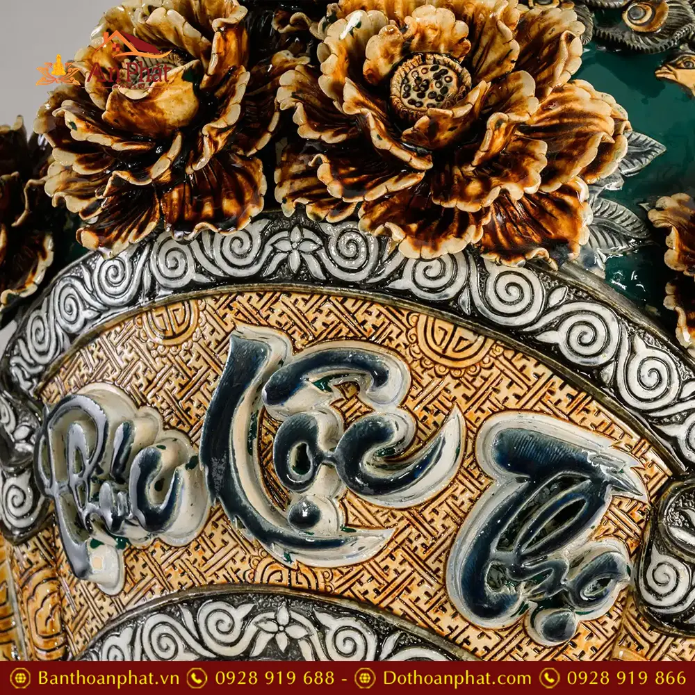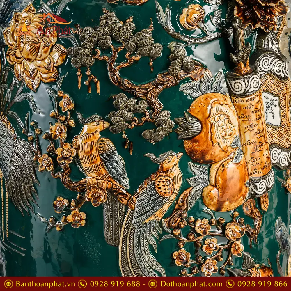 Lọ Lộc Bình Phúc Lộc Thọ Kênh Men Màu Xanh Đắp Nổi Bát Tràng DT932