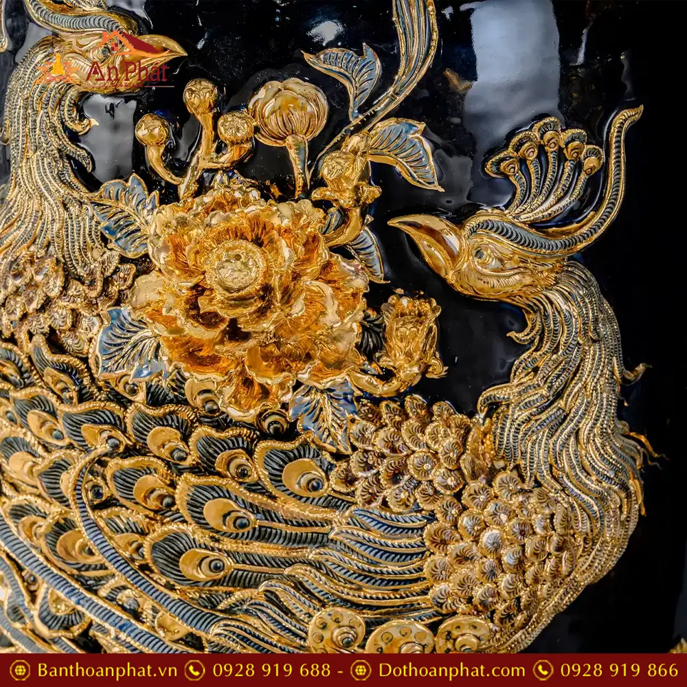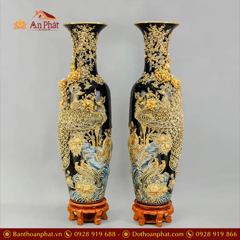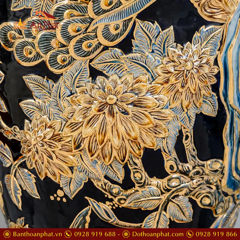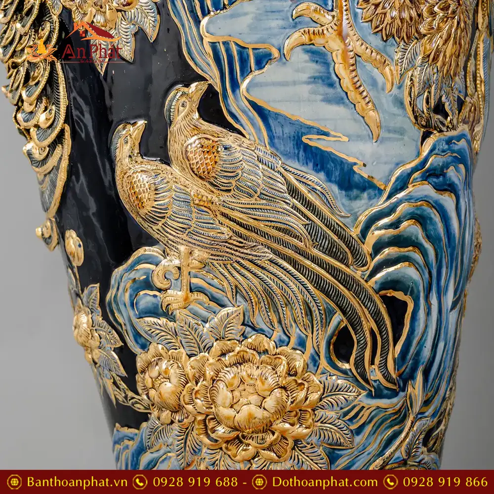 Lọ Lộc Bình Xanh Coban Đắp Nổi Công Đào Vẽ Vàng Cao Cấp DT962