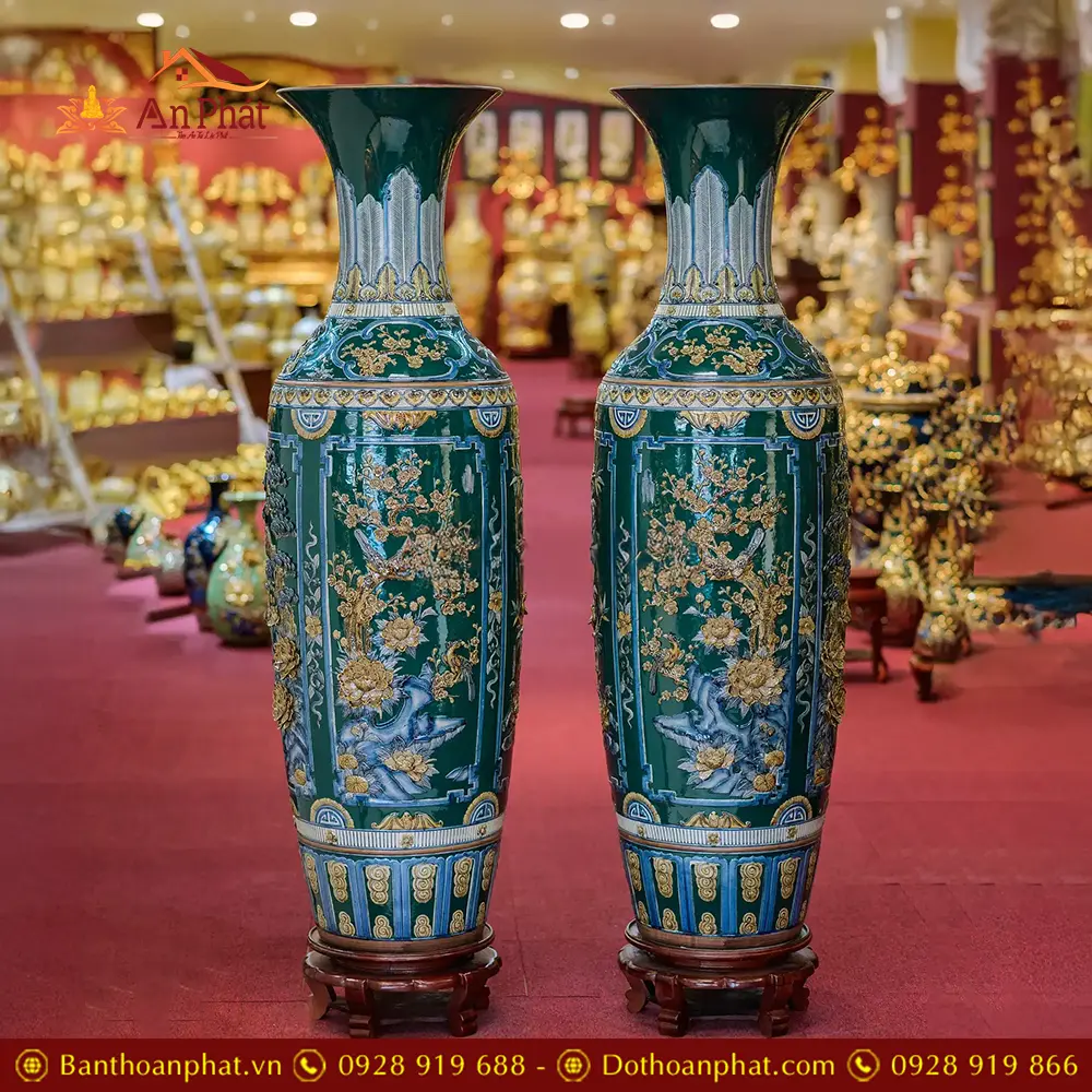 Lọ Lộc Bình Xanh Lục Bảo Đắp Nổi Tứ Cảnh Vẽ Vàng Cao Cấp DT958