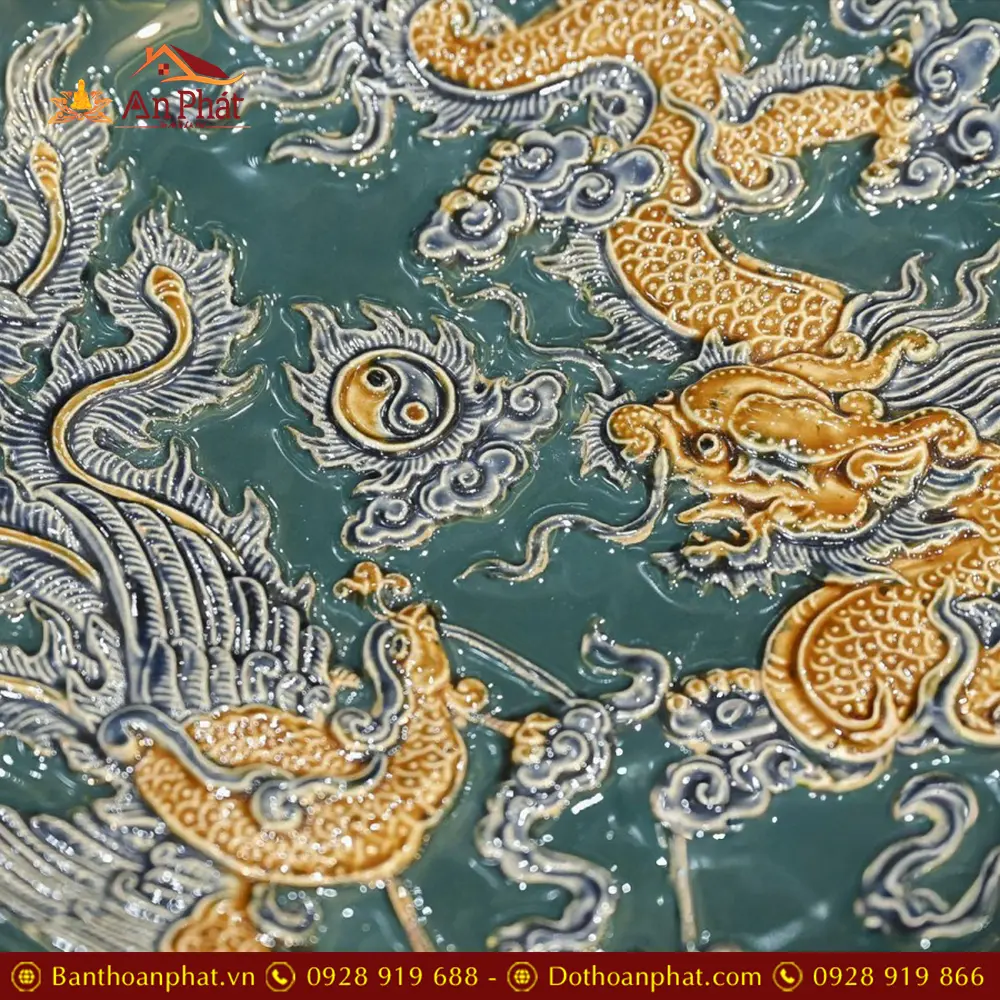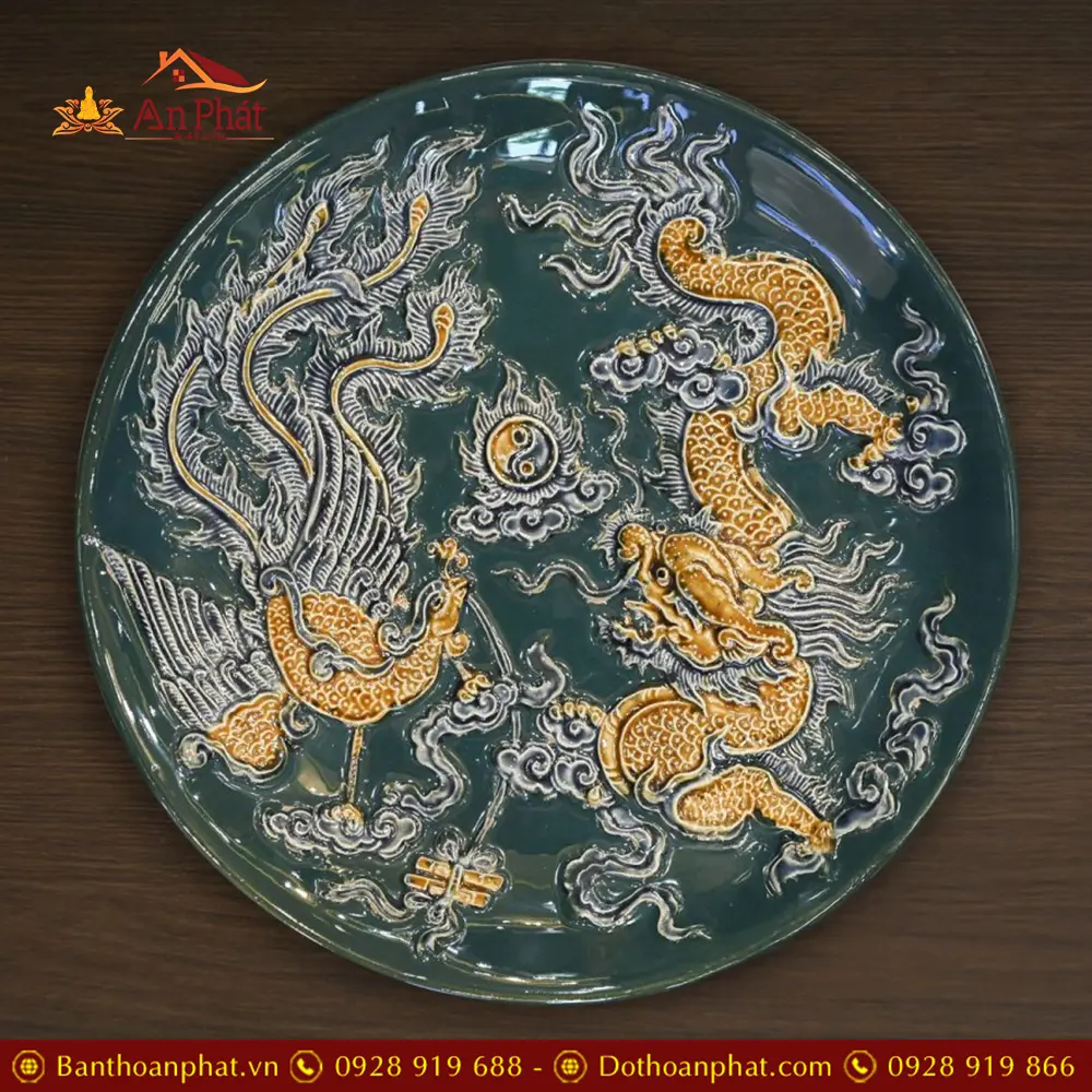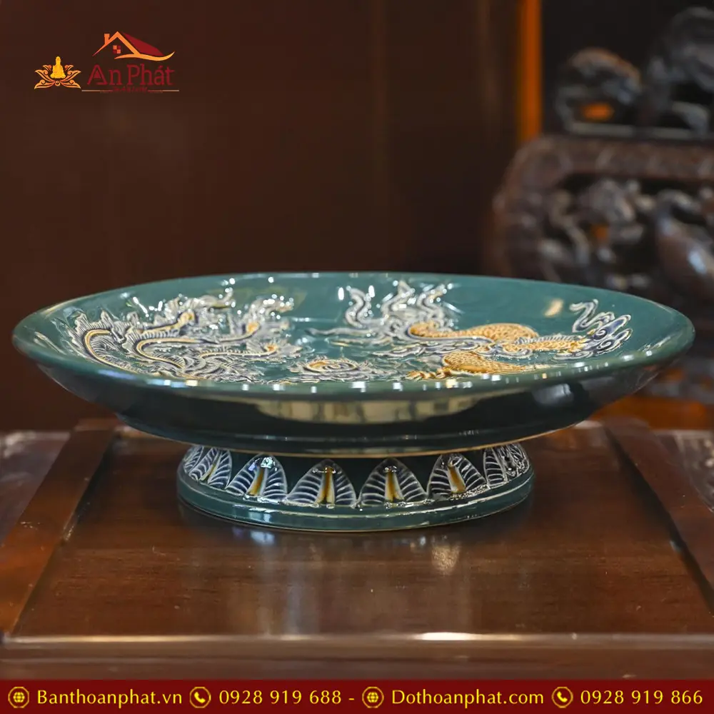 Mâm Bồng Men Bát Tràng Xanh Đắp Nổi Long Phụng Chầu Nguyệt DT700