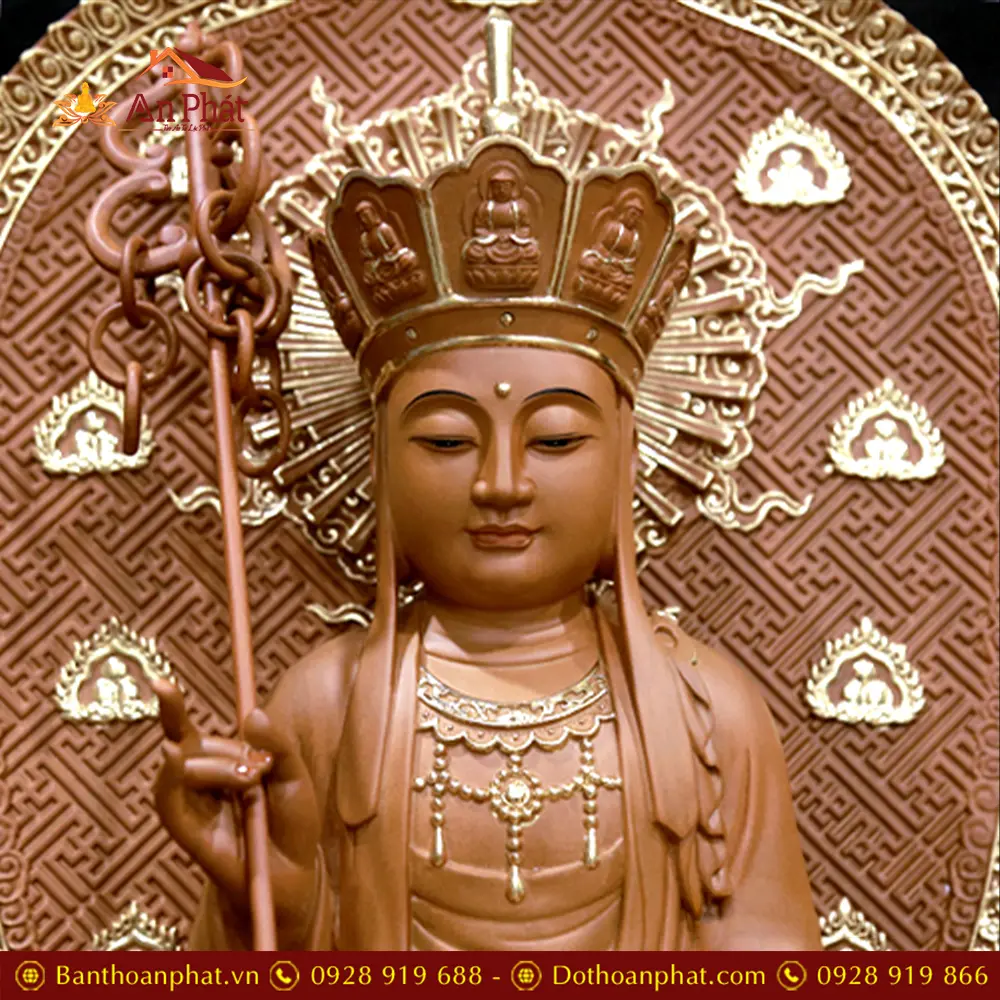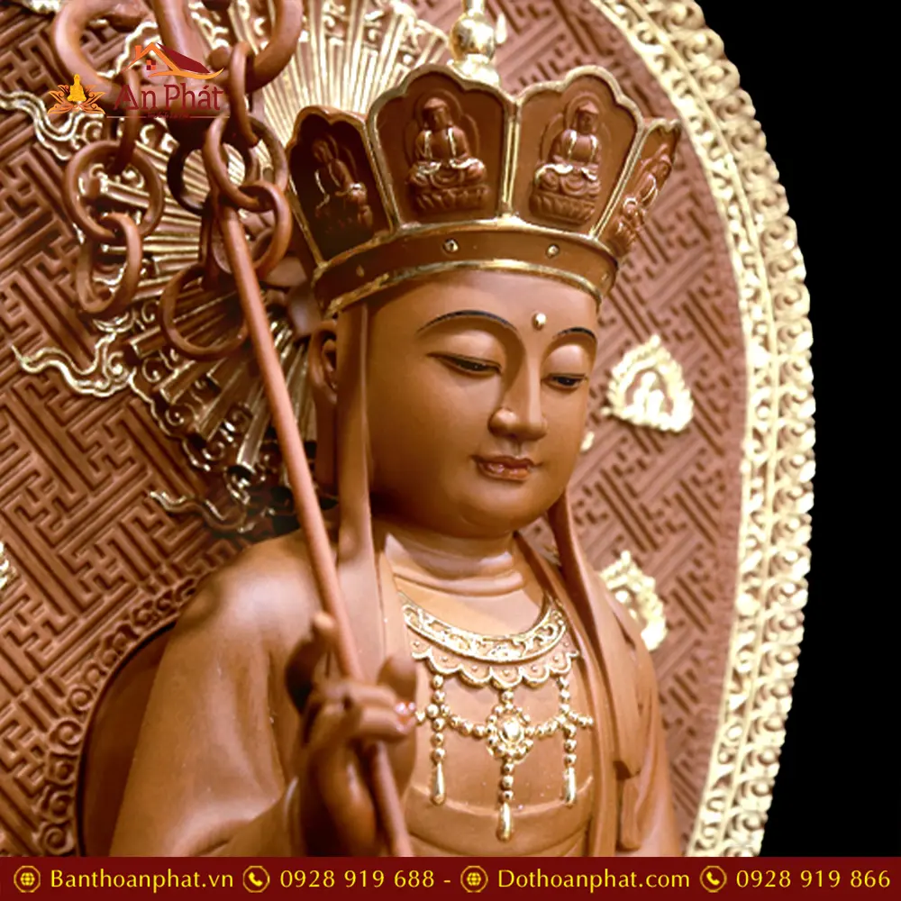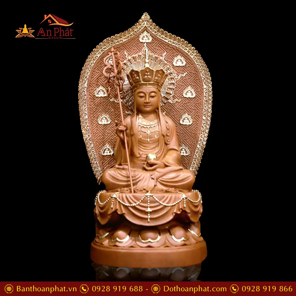 Tượng Địa Tạng Vương Bồ Tát Gỗ Long Não Nhập Khẩu Ngồi Đài Sen Có Lá Đề Viền Vàng T2665