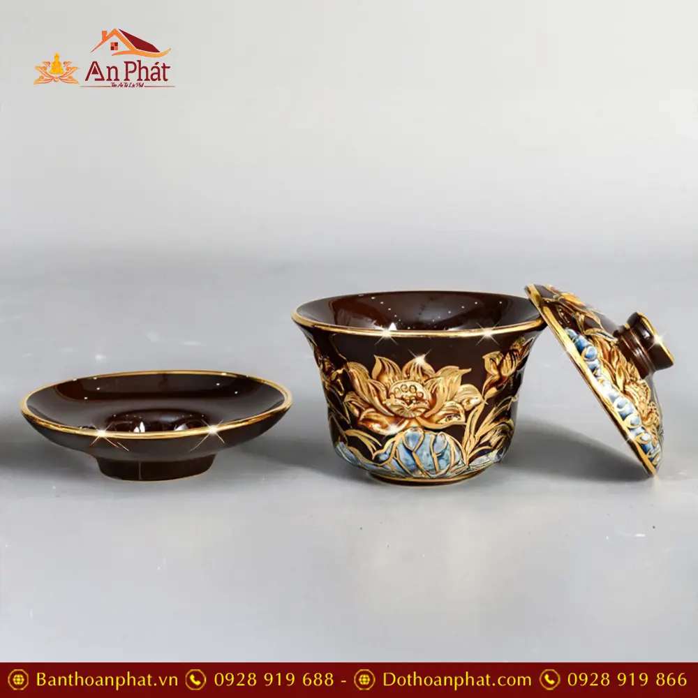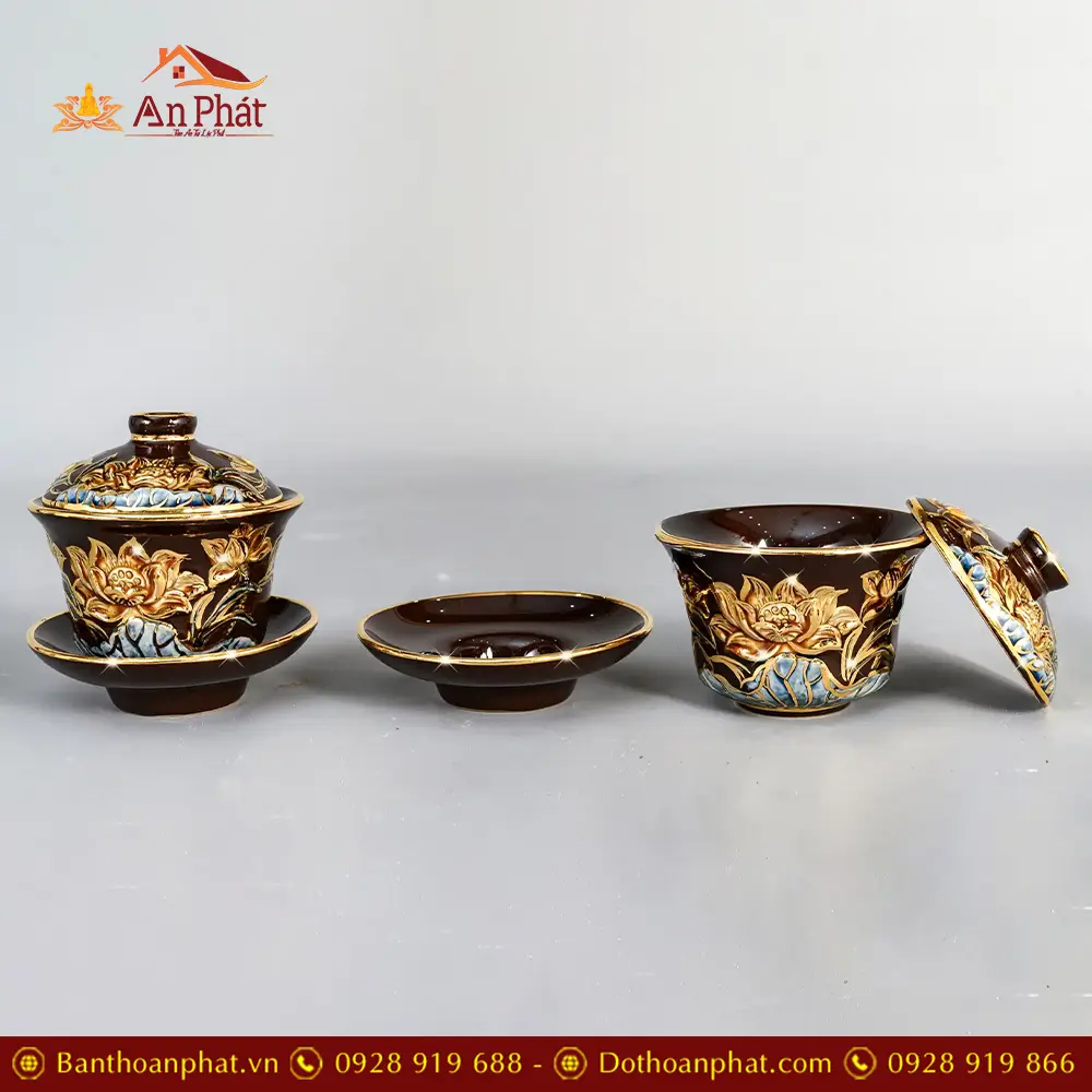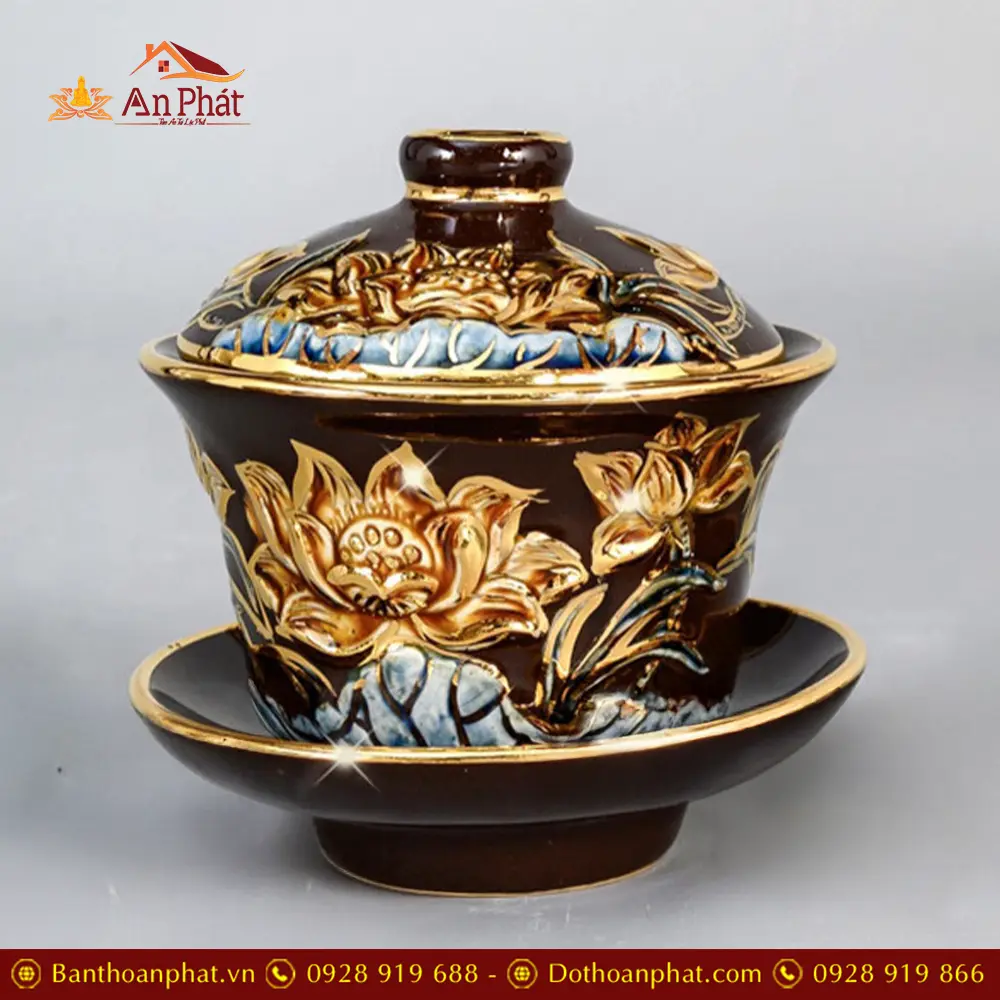 Bát Sâm Cao Cấp Màu Nâu Bát Tràng Đắp Nổi Vẽ Vàng DT912