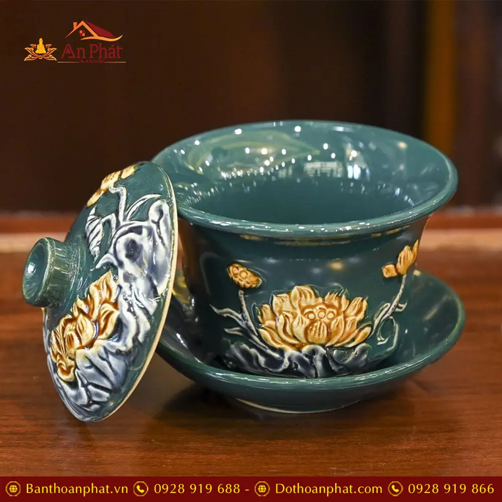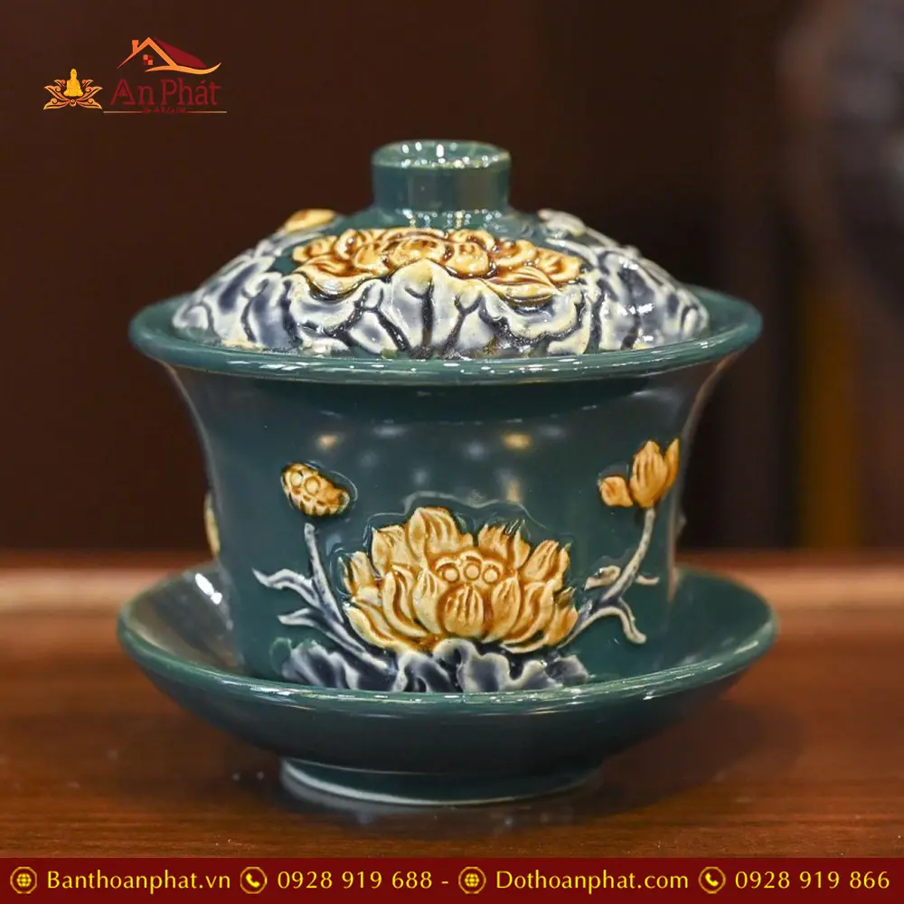 Bát Sâm Thờ Men Màu Xanh Đắp Nổi Bát Tràng DT876