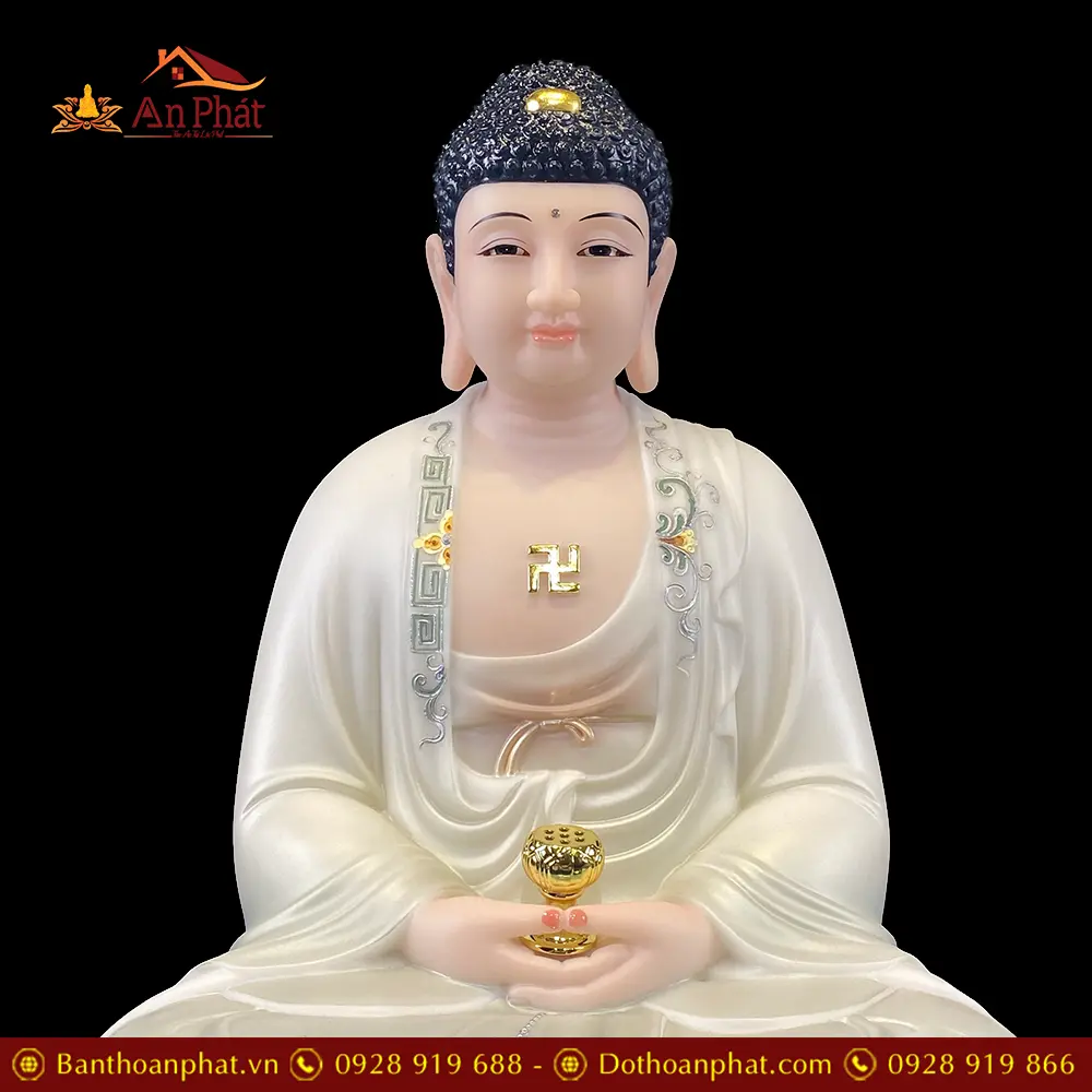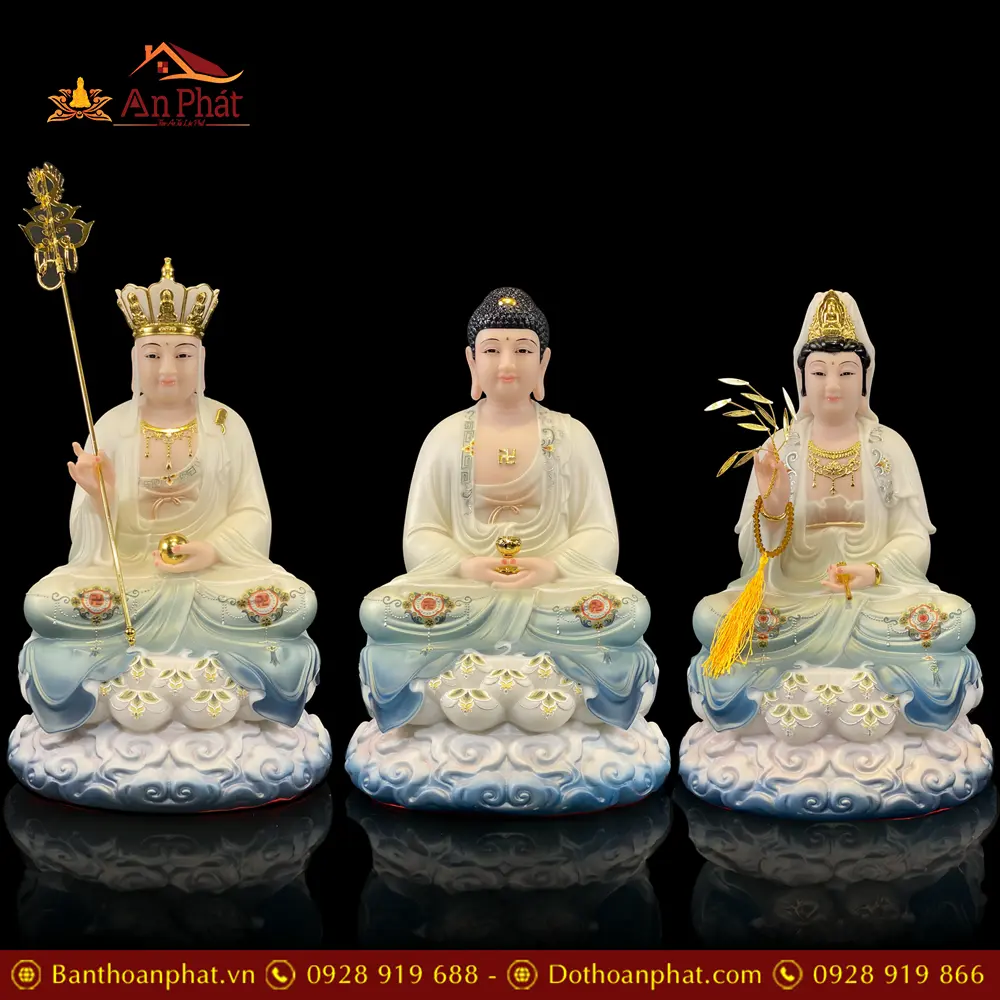 Bộ Tượng Ta Bà Tam Thánh Bằng Bột Đá Ngồi Đế Mây Sơn Xanh Cao Cấp T2369