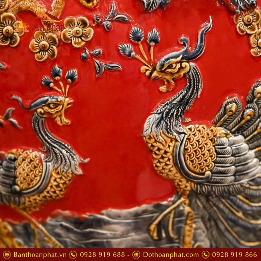 Choé Phong Thuỷ Màu Đỏ Đắp Nổi Công Đào Kênh Bát Tràng DT984