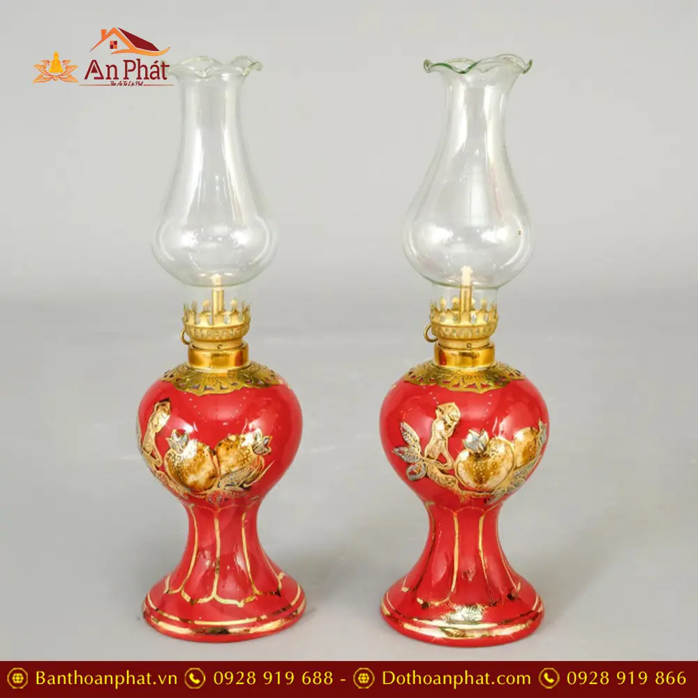 Đèn Dầu Thờ Men Màu Đỏ Đắp Nổi Vẽ Vàng DT777