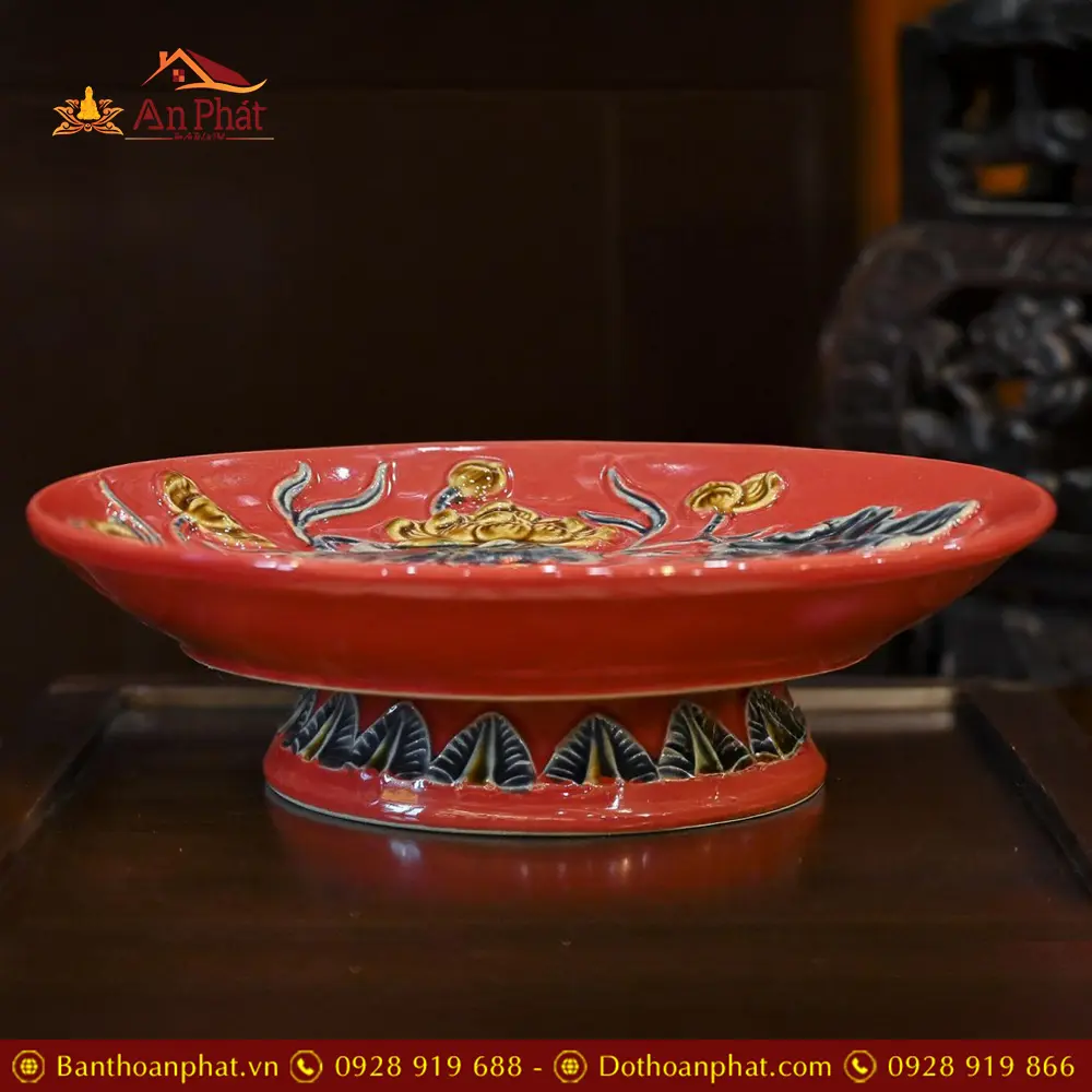 Mâm Bồng Thờ Men Đỏ Đắp Nổi Hoa Sen Gốm Bát Tràng DT702