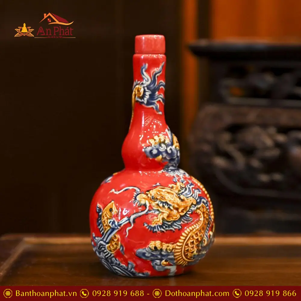 Nậm Rượu Bầu 2 Men Màu Đỏ Đắp Nổi Bát Tràng DT820