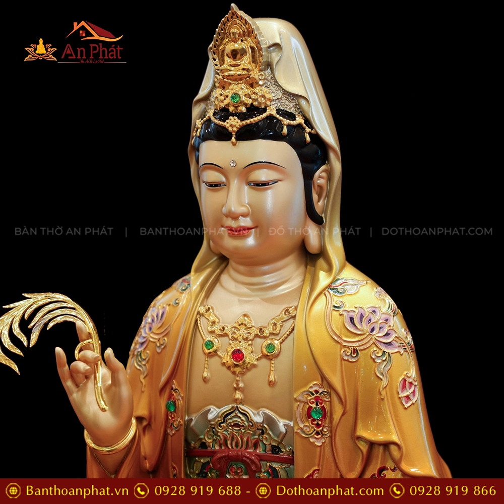 Tôn Tượng Quan Thế Âm Ngọc Thạch Phủ Đồng Tọa Lá Sen Vẽ gấm Đỏ cam T2392