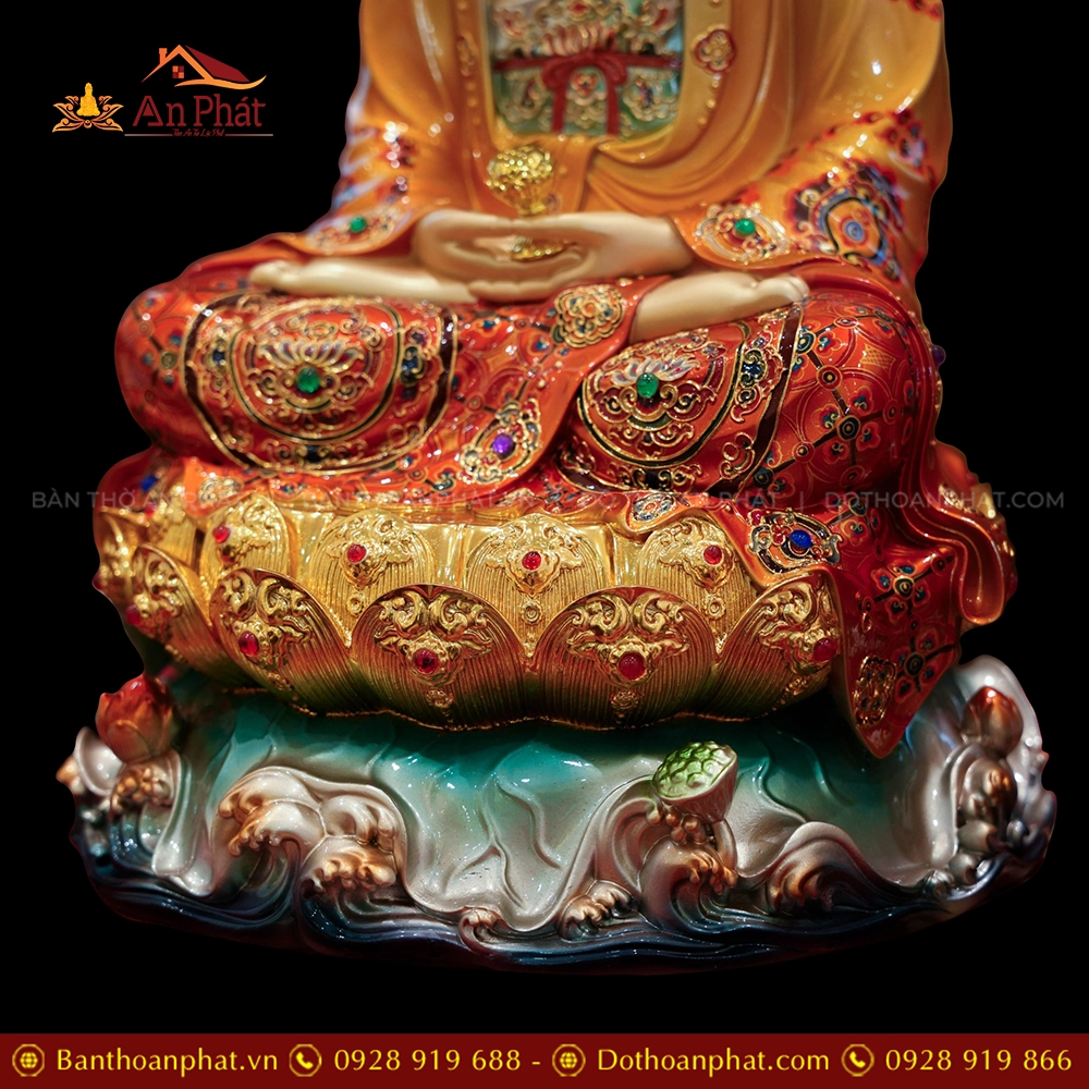 Tôn Tượng Thích Ca Mâu Ni Ngọc Thạch Phủ Đồng Tọa Lá Sen Vẽ gấm Đỏ cam T2391