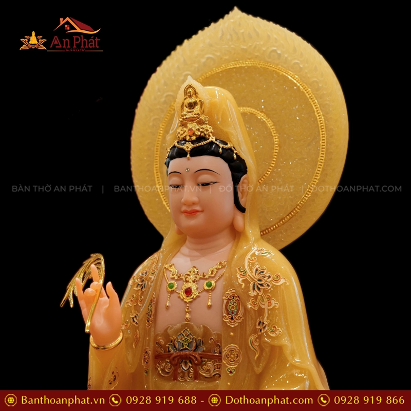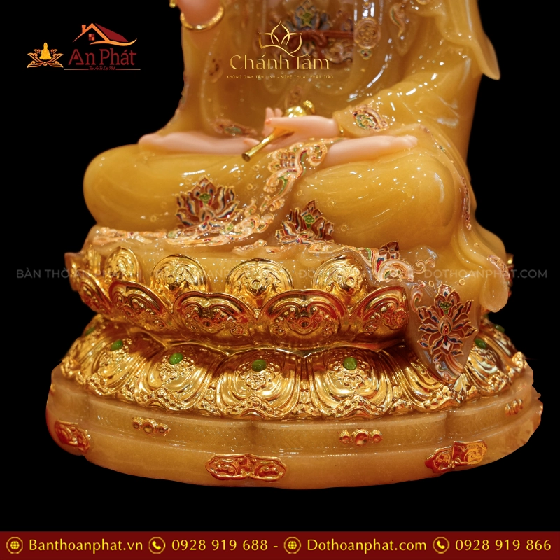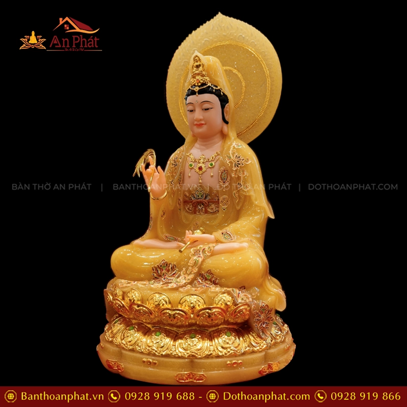 Tượng Quan Thế Âm Bồ Tát Tọa Đài Sen Dát Vàng Ngọc Thạch Có Lá Đề T2383